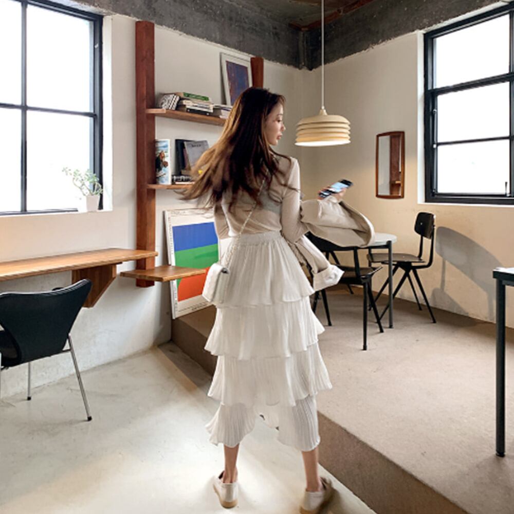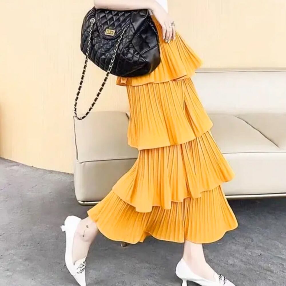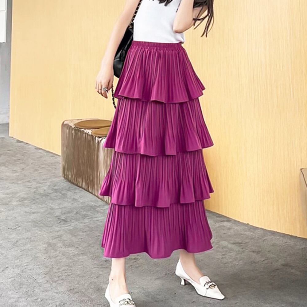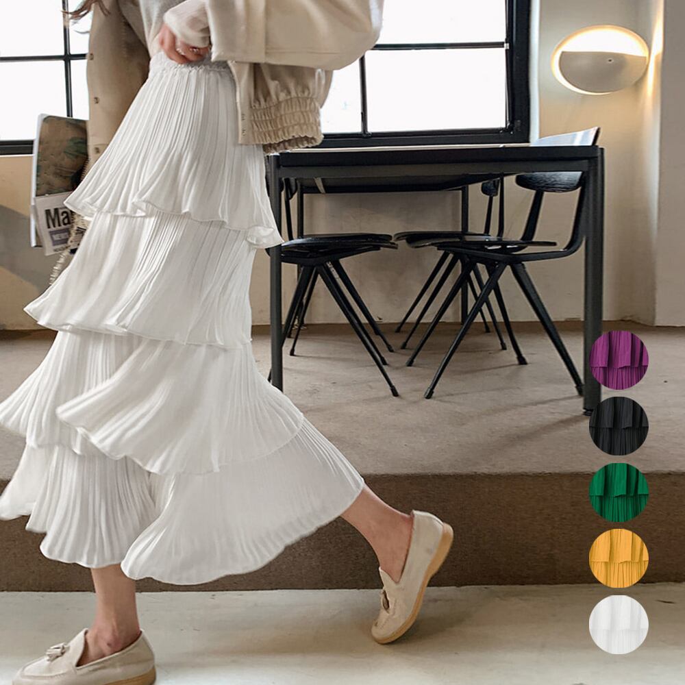 4段切り替えのティアードデザインにプリーツを組み合わせた存在感のある華やかなスカート