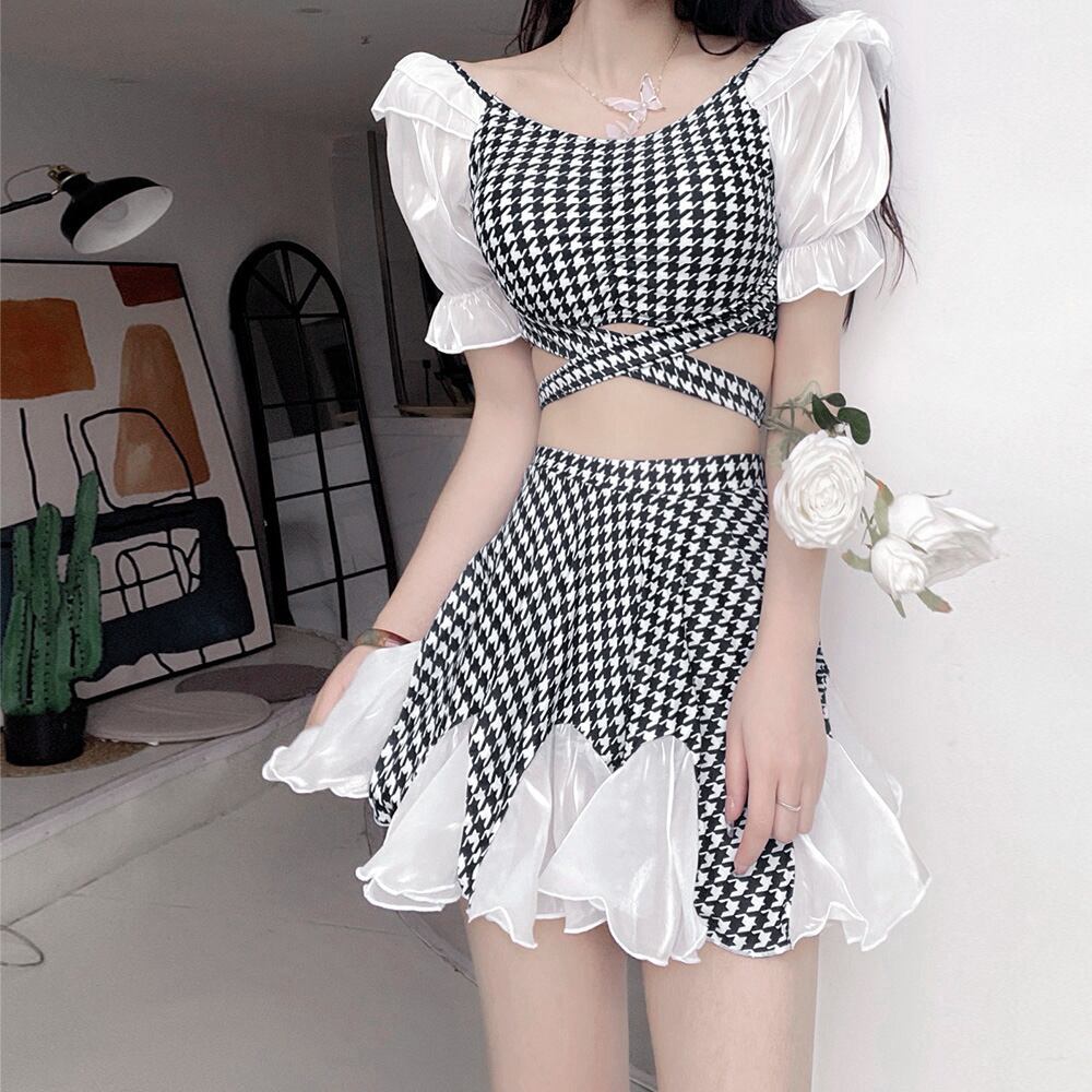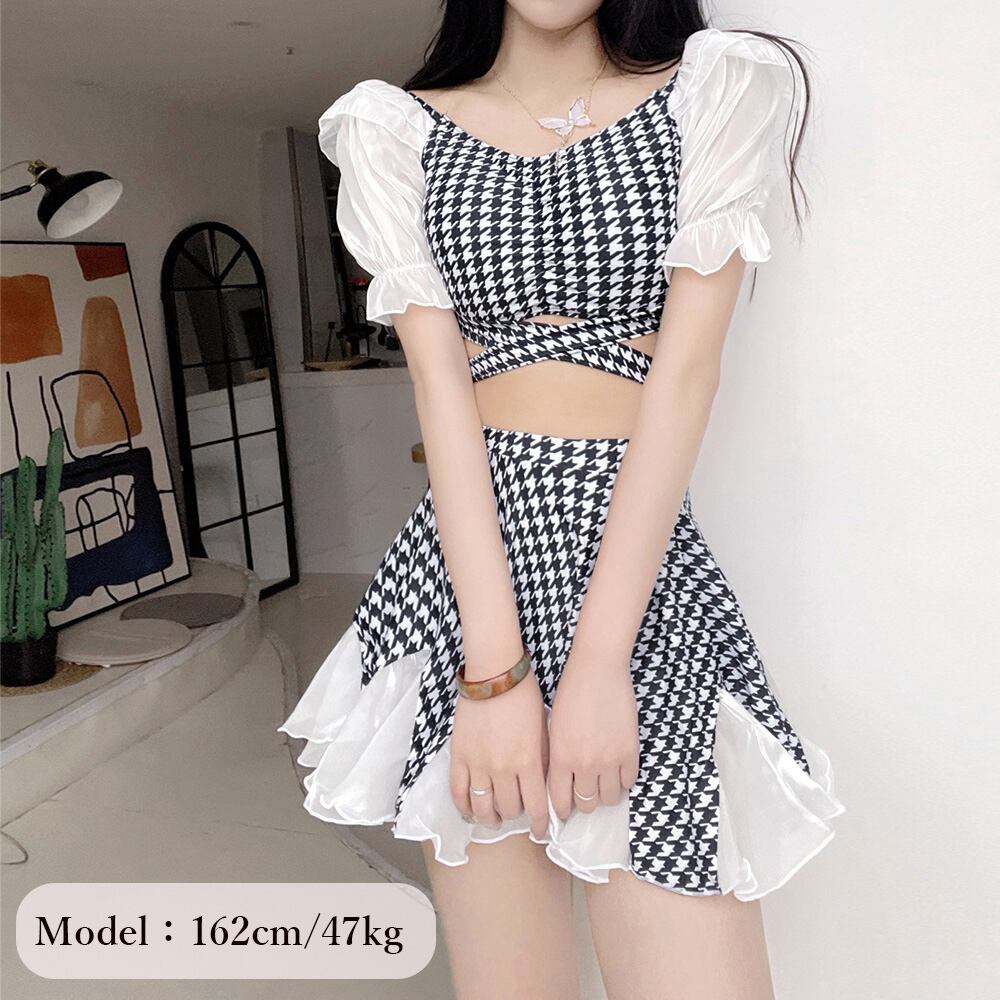 セクシー千鳥格子水着 キャザー パッド付き水着 クロスストラップ フレアスカート パフスリーブ バックリボン プール温泉