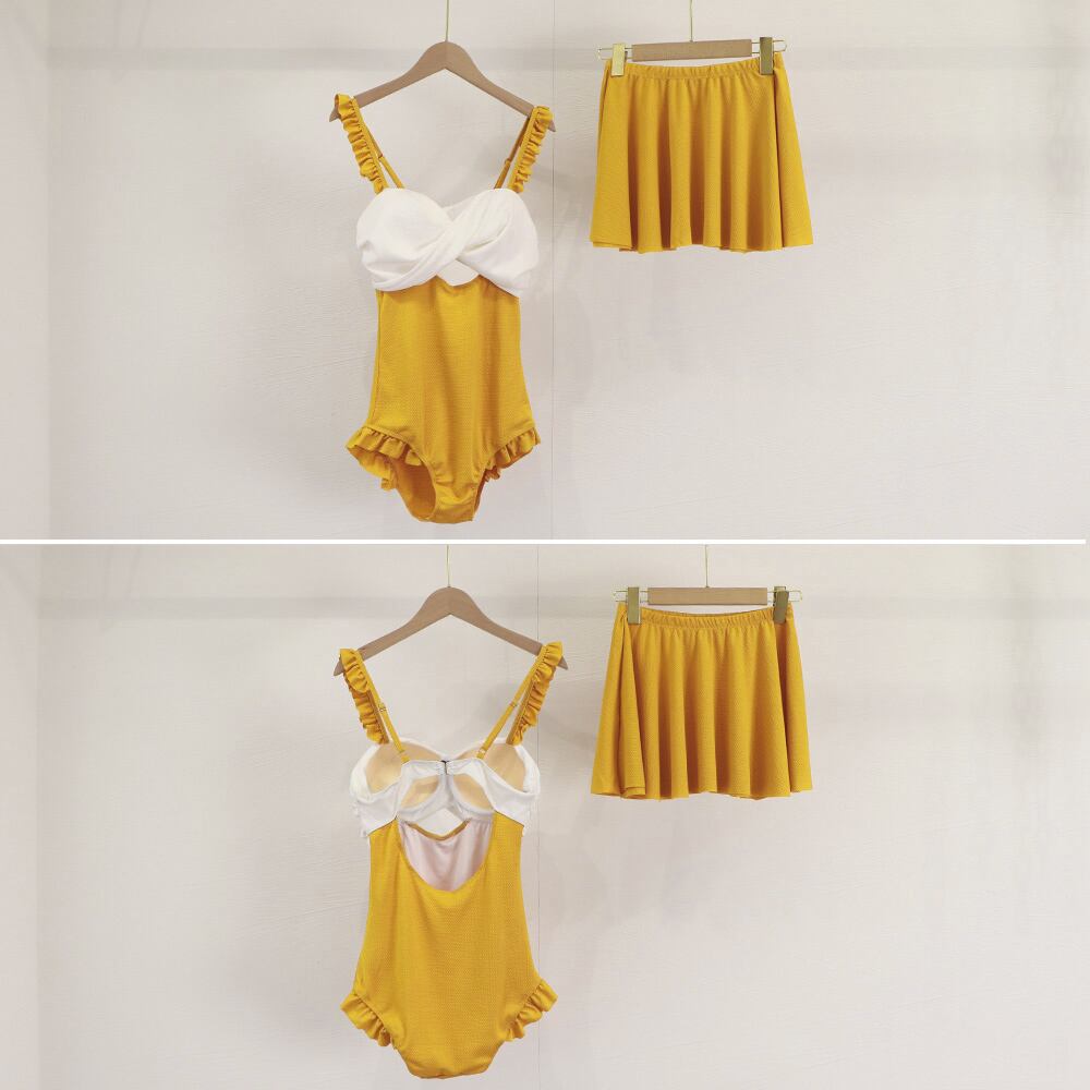スカート付き ワンピース水着 2点セット バックシャン リボン レオタード水着 ハイウエストビーチウェア ぽっちゃり水着