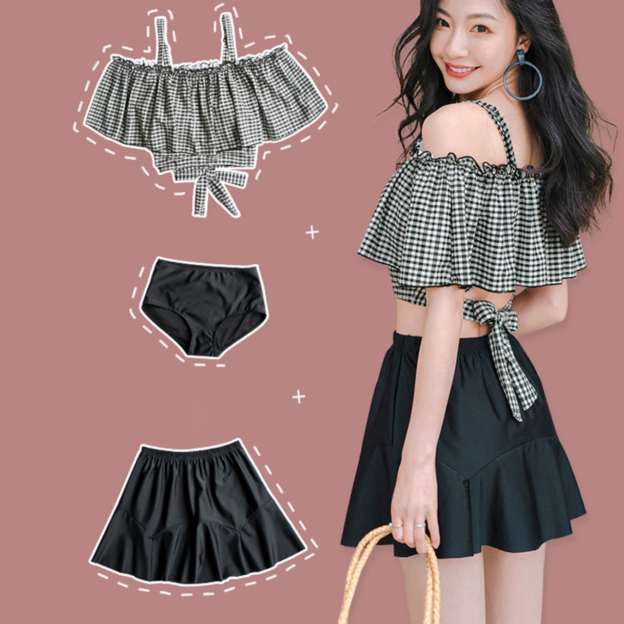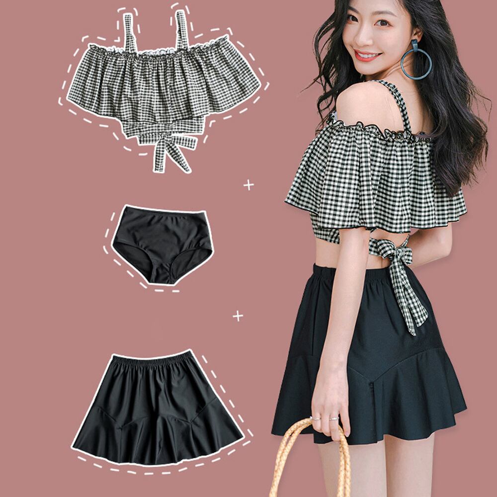 お洋服感覚でラクに着られるオフショルダー水着上下3点セット