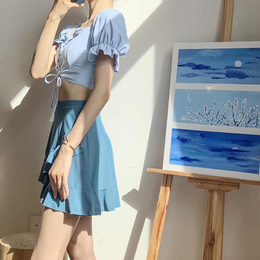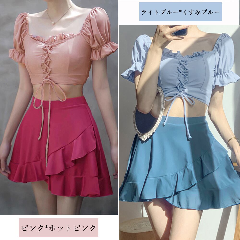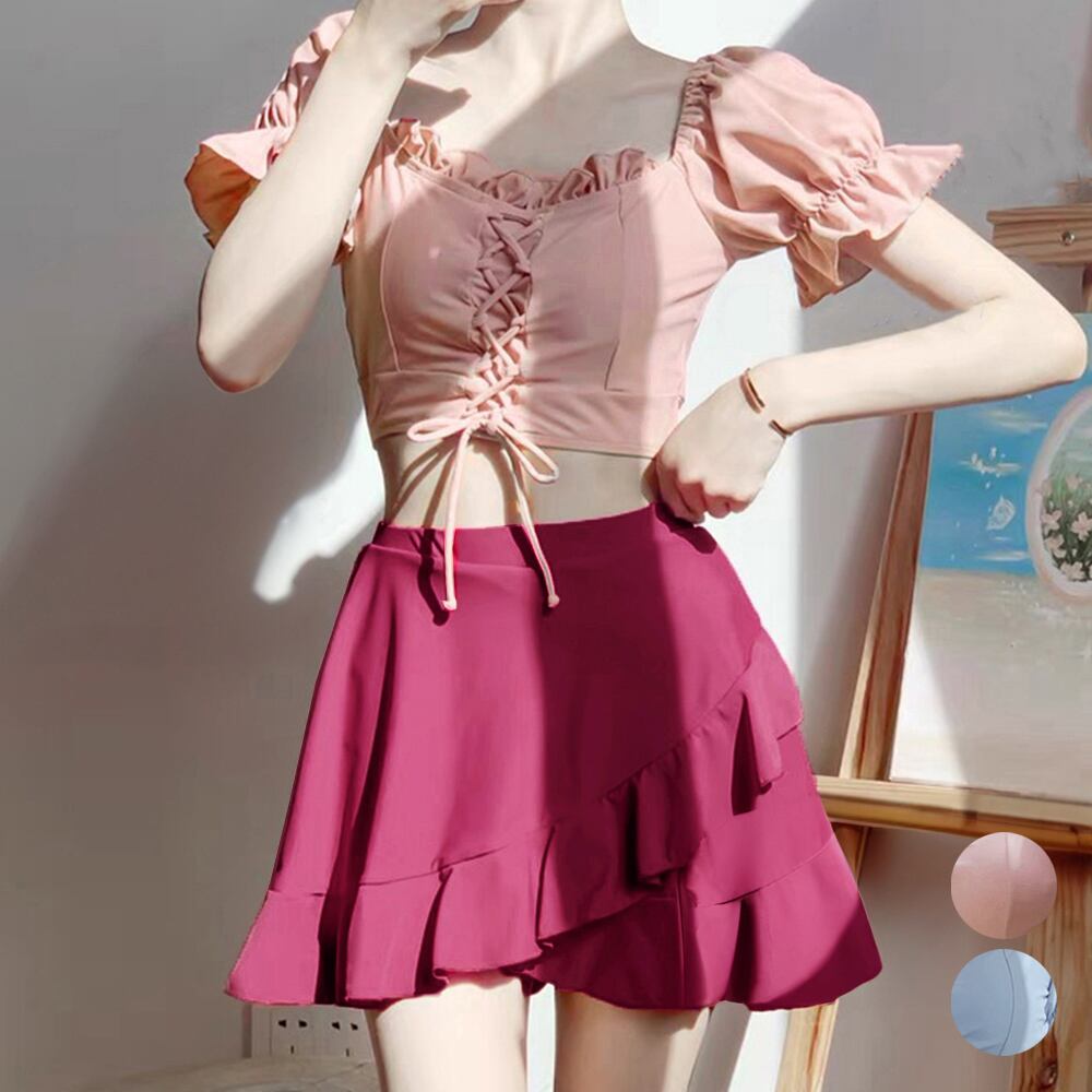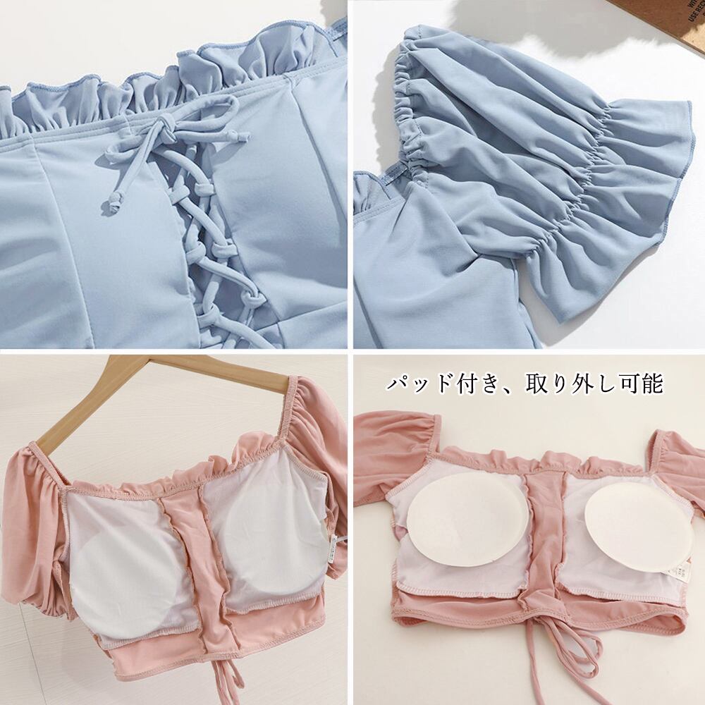 レースアップ水着 2点セット オフショルトップス パンツ付き フリルミニスカート セパレート水着 露出控えめビーチウェア