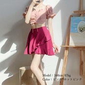 スカート部分をクロスさせることでフリル素材がプラスされ更にキュートに、脚長見せも忘れずスタイルをより美しく魅せてくれる