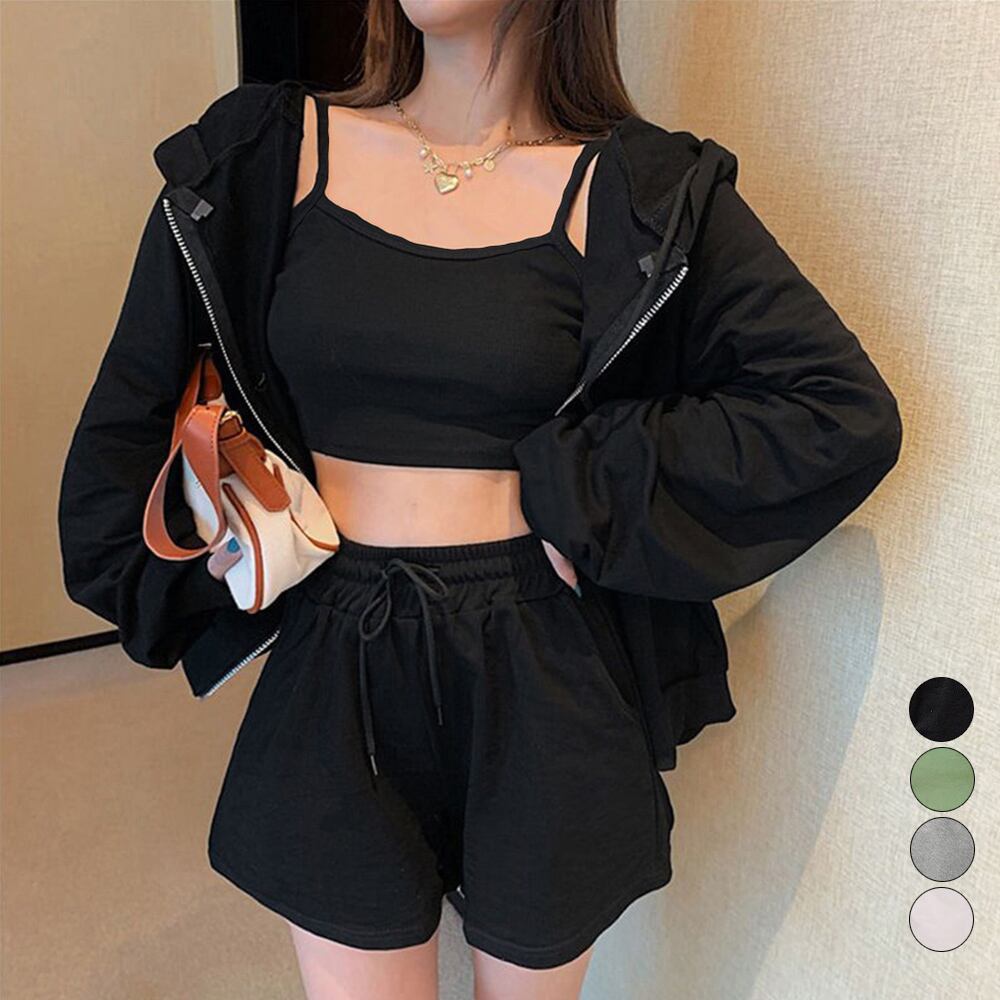 可愛い 部屋着セット 長袖 ルームウェア カジュアル ジップアップパーカー ショート丈キャミソール ショートパンツ 春夏