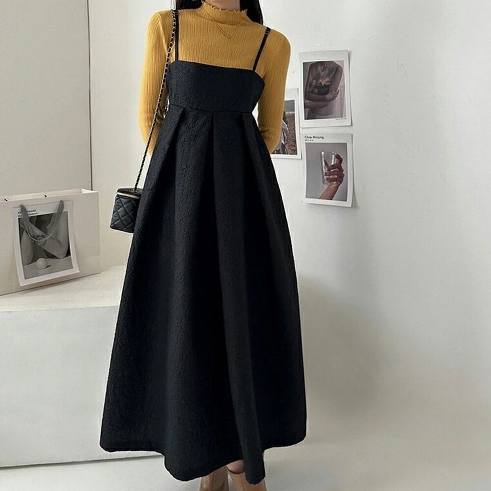Aラインロングワンピース レディース 体型カバー 重ね着ジャンパースカート オールインワンゆったり おしゃれキャミワンピ