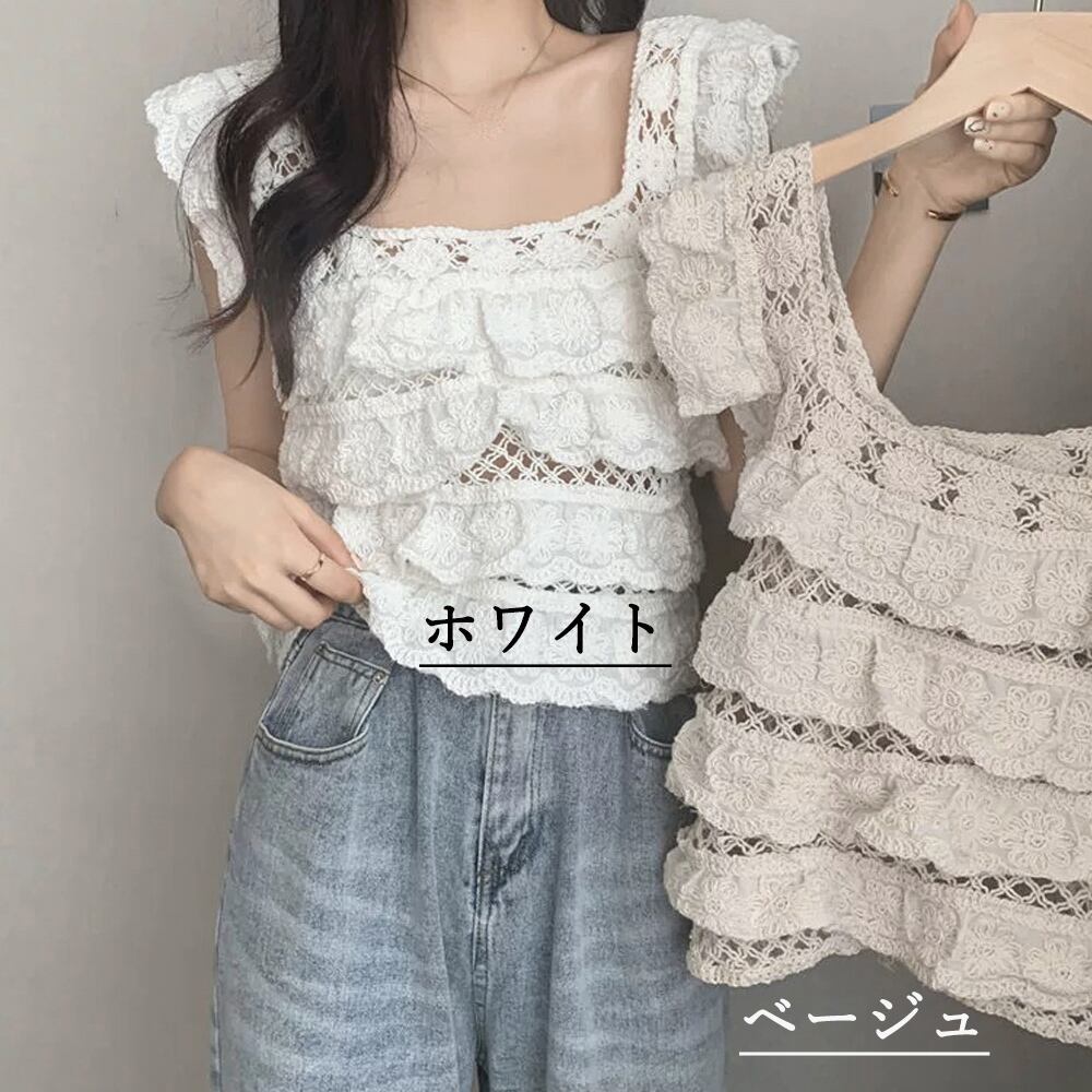 かぎ編み ベスト 肌見せ スクエアネック 重ね着 セクシー 韓国ファッション 大人可愛い フリルプルオーバー
