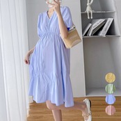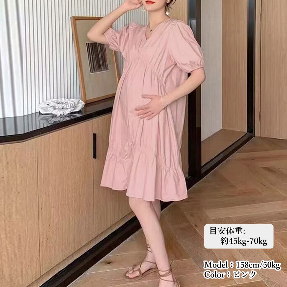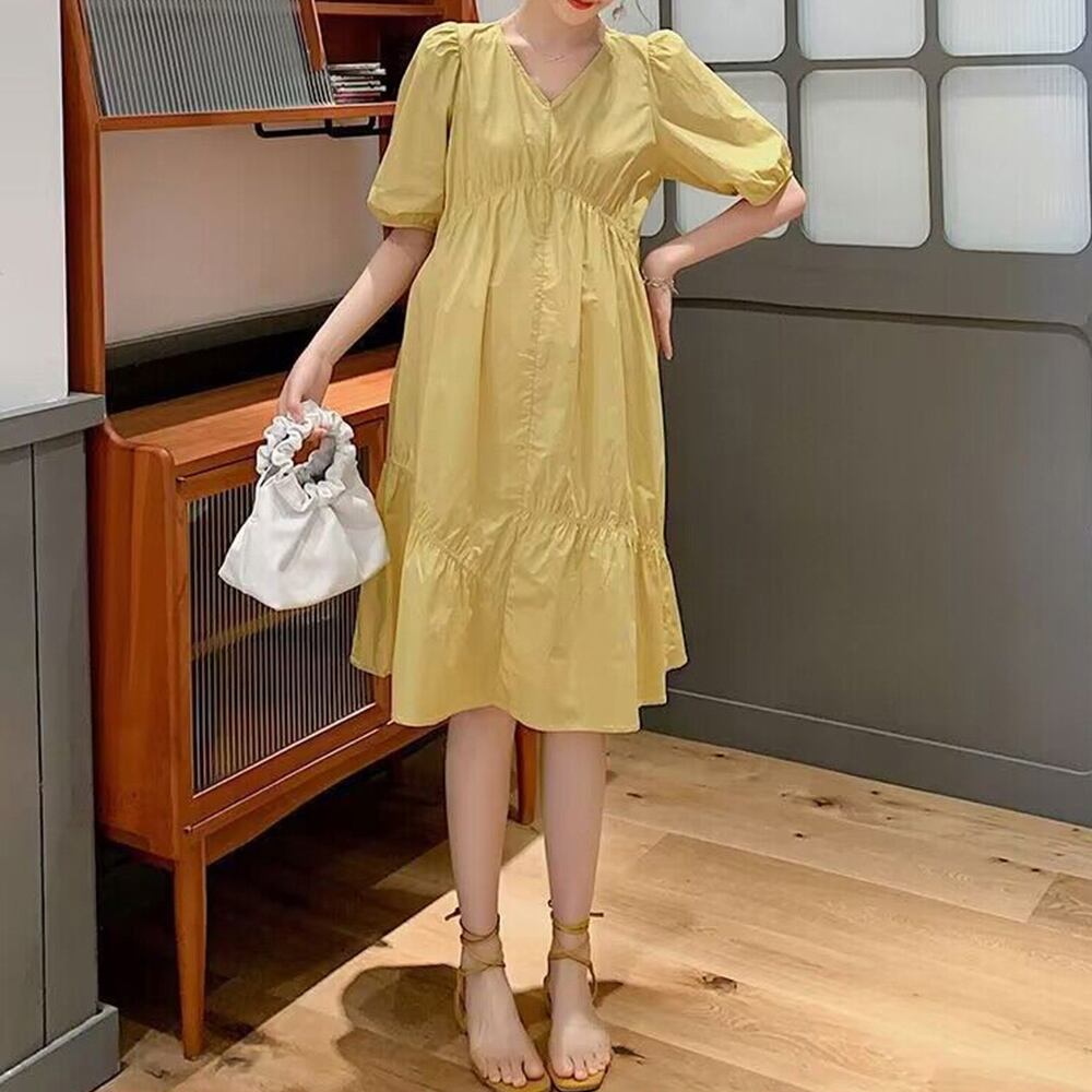 ハイウエスト お洒落 ゆったり妊婦服 パフスリーブ  AラインワンピースVネック 産前産後兼用 半袖マタニティウェア韓国