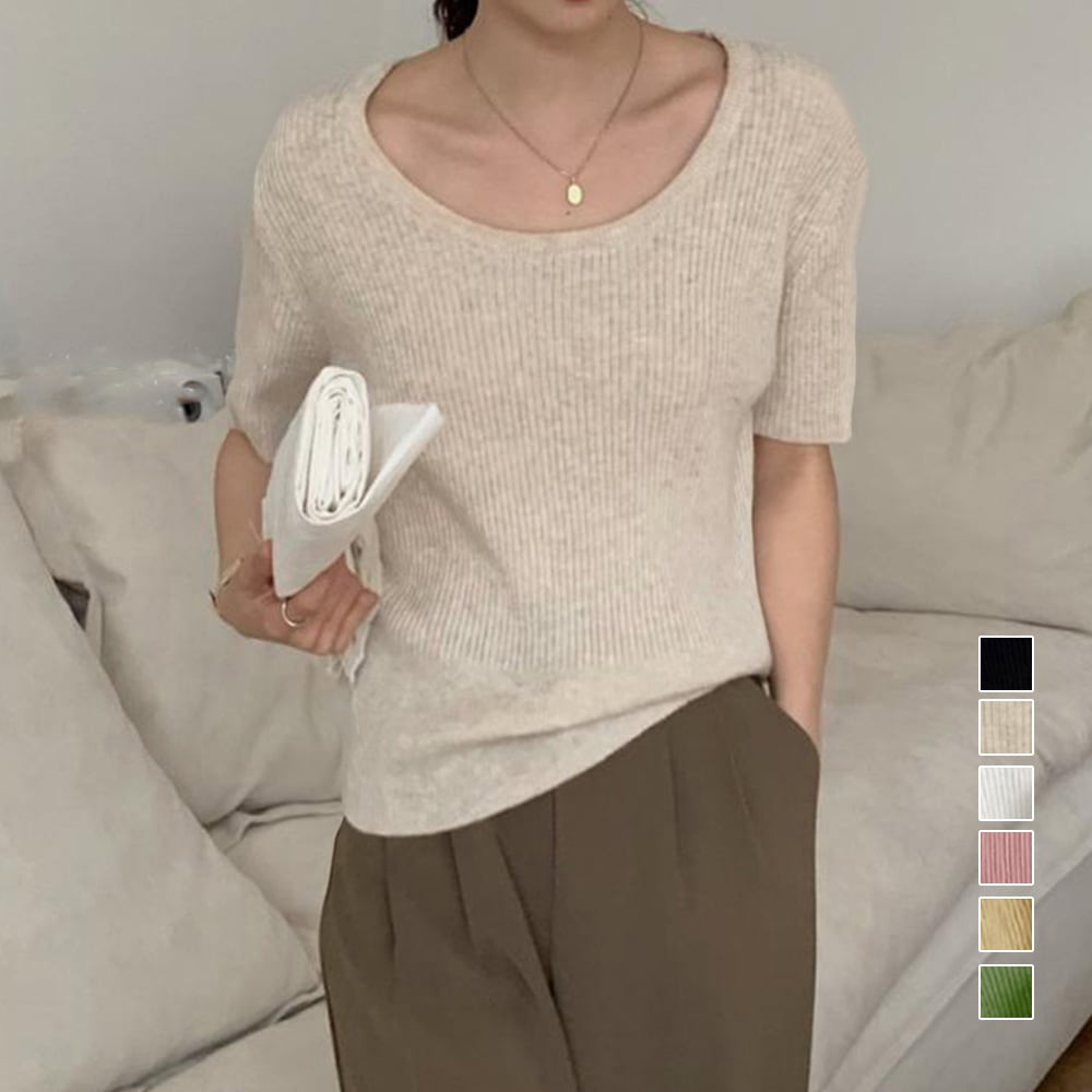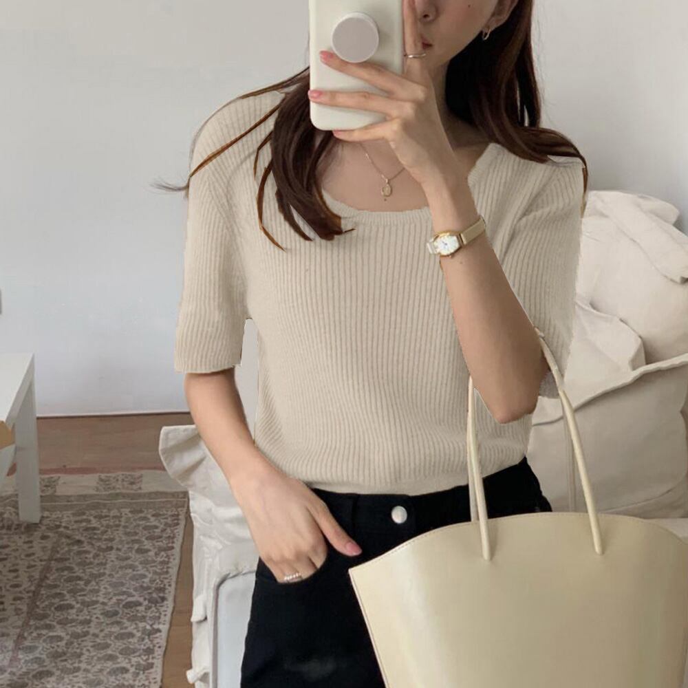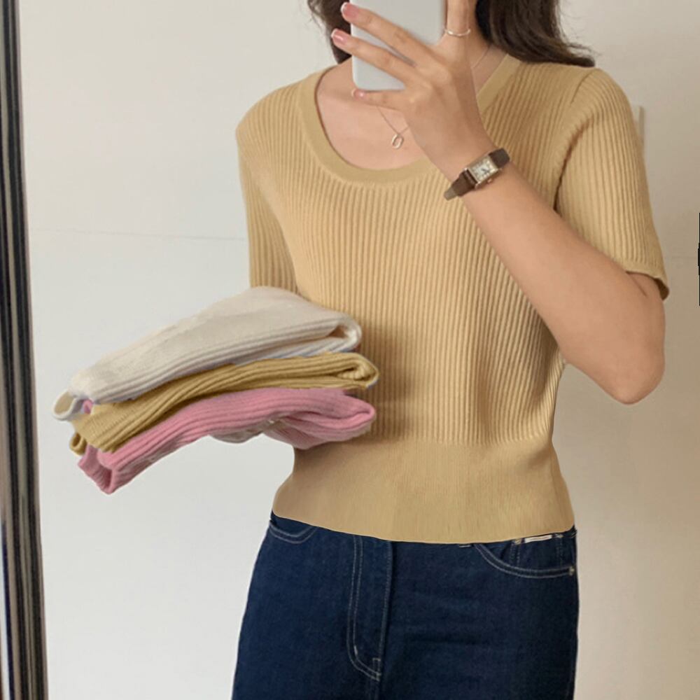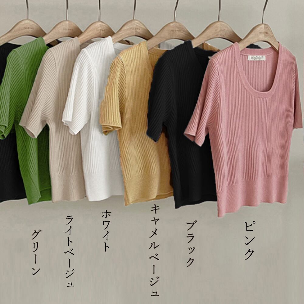 Uネック リブニットTシャツ 韓国カットソー 無地 ベーシック 夏トップス 柔らかい薄手 大人カジュアル着やせ 6色展開