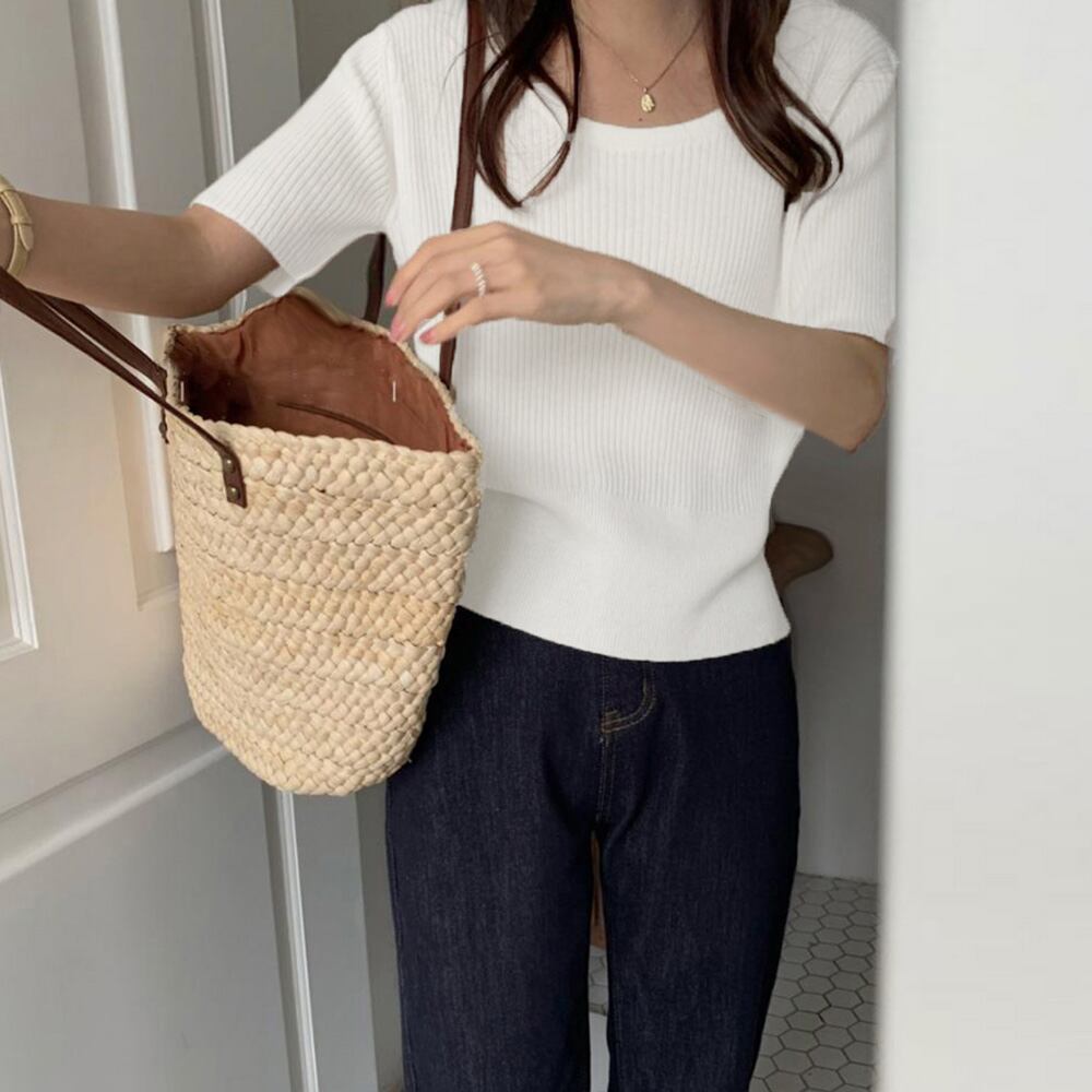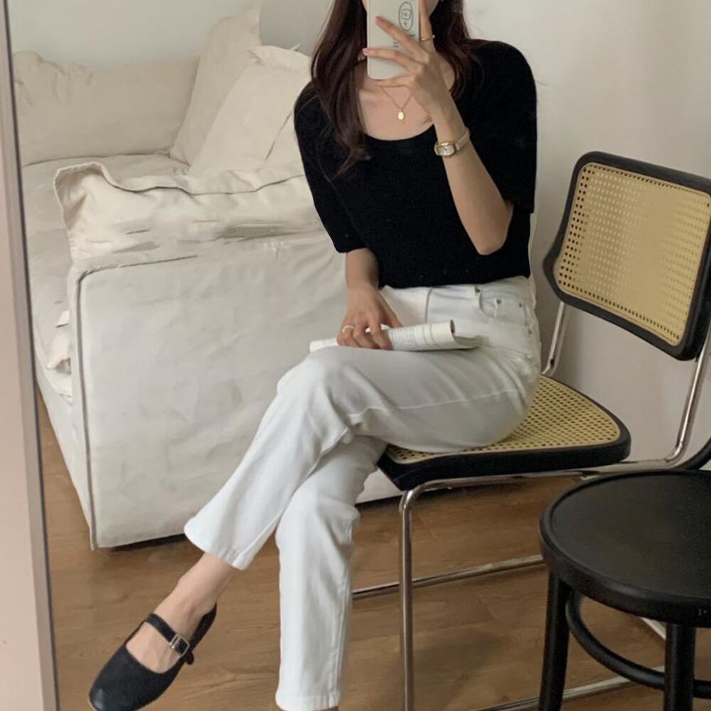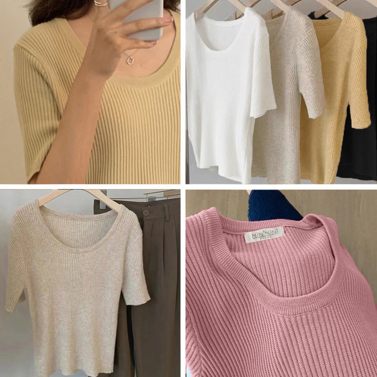 Uネック リブニットTシャツ 韓国カットソー 無地 ベーシック 夏トップス 柔らかい薄手 大人カジュアル着やせ 6色展開