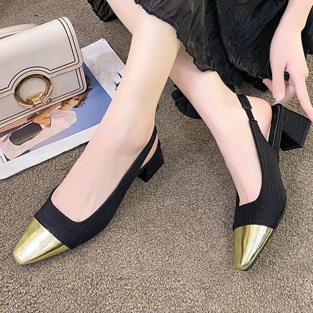 モダンで洗練された印象を与えるつま先切り替えデザインのバックストラップパンプスです