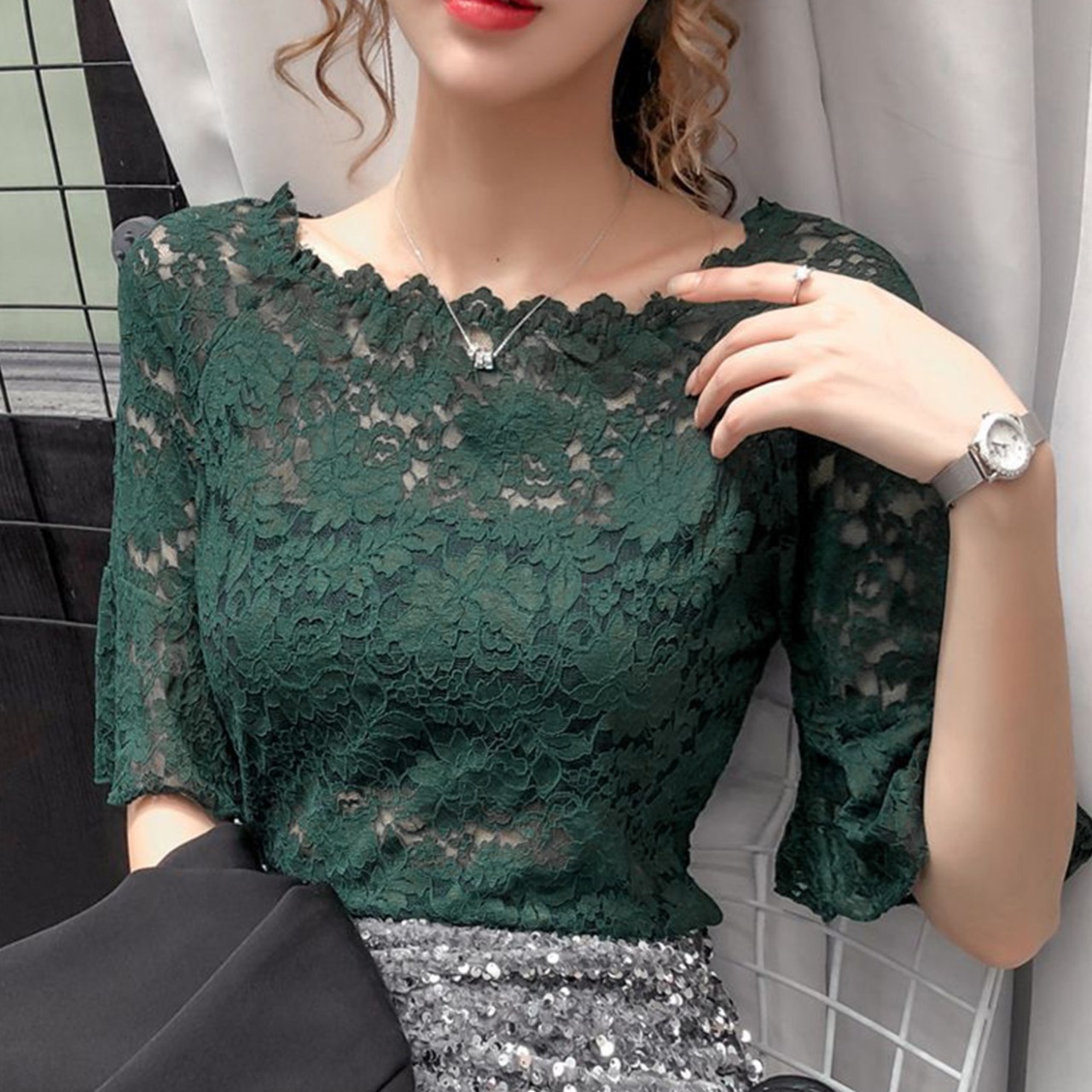 エレガント 透け感 レーストップス レディース 大人可愛い 重ね着インナー ベルスリーブ 韓国 シアーブラウス きれいめ