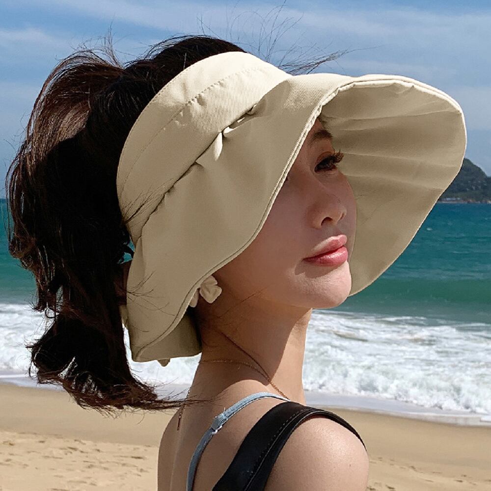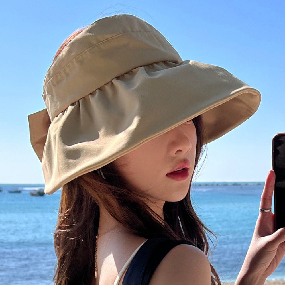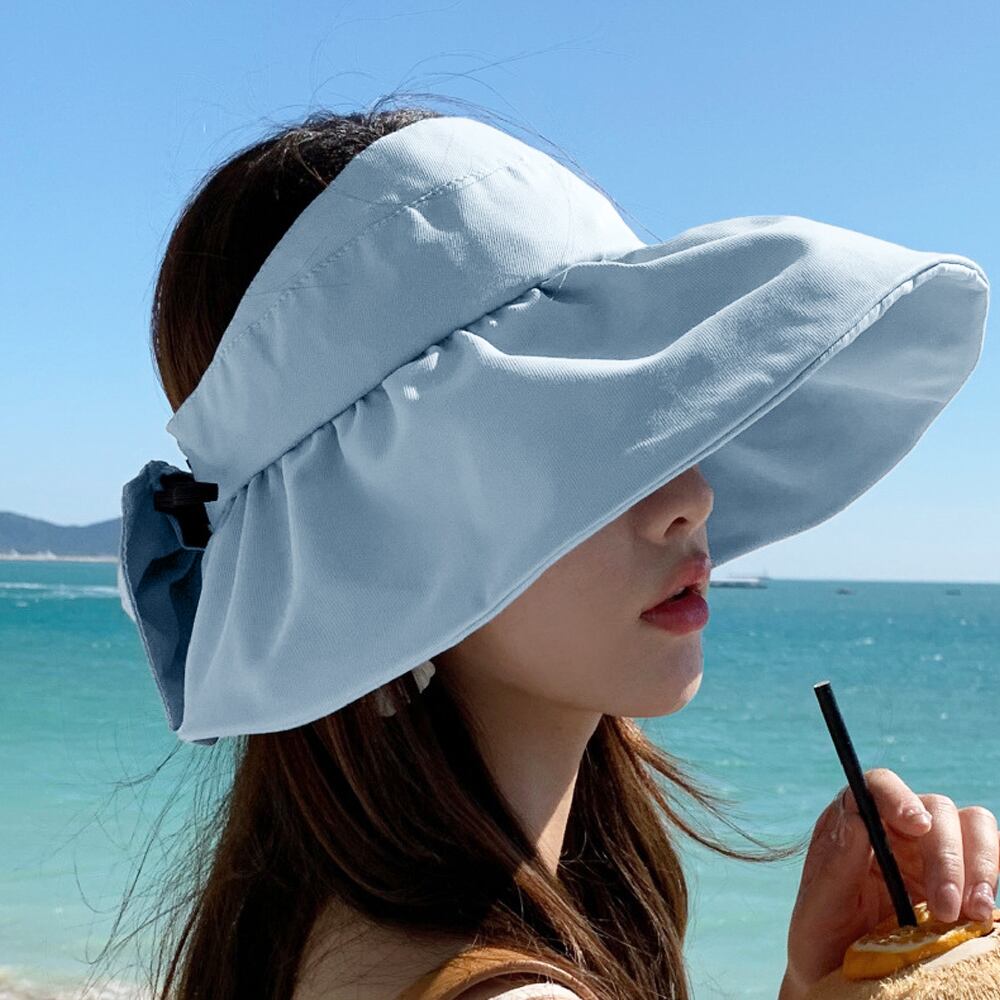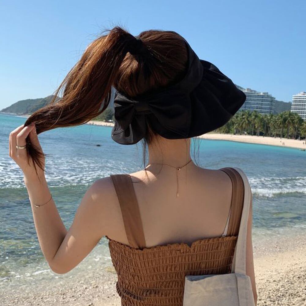 女性らしいバックリボンとつば広のデザインで、お洒落に紫外線対策ができるサンバイザーです。