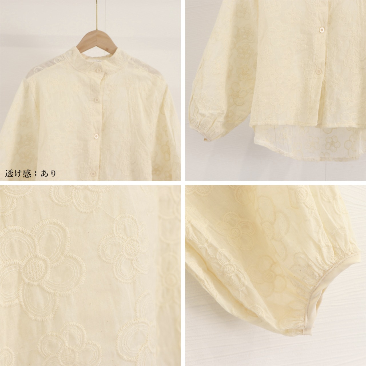 シアーなジャカードレースが印象的な存在感ある1枚に、ほのかな甘さをプラスするクラシカルな花柄刺しゅうブラウス