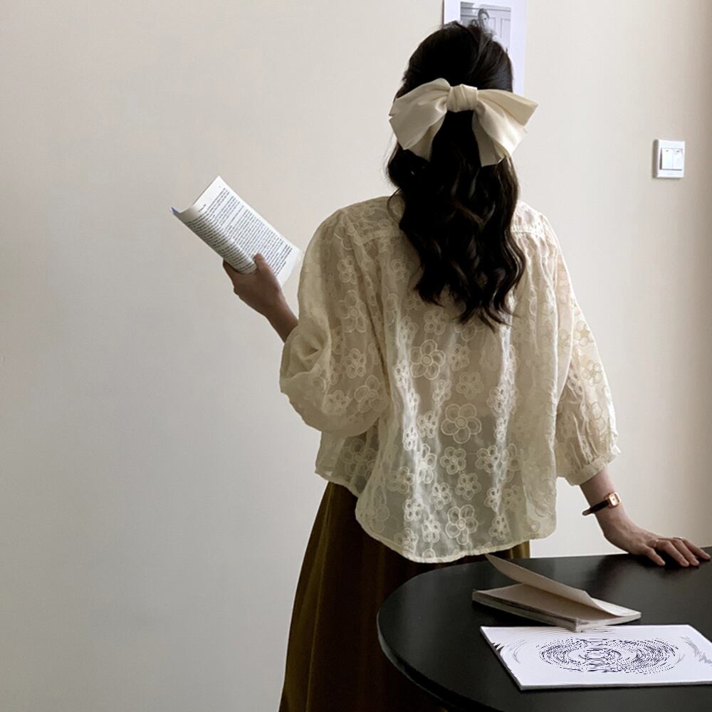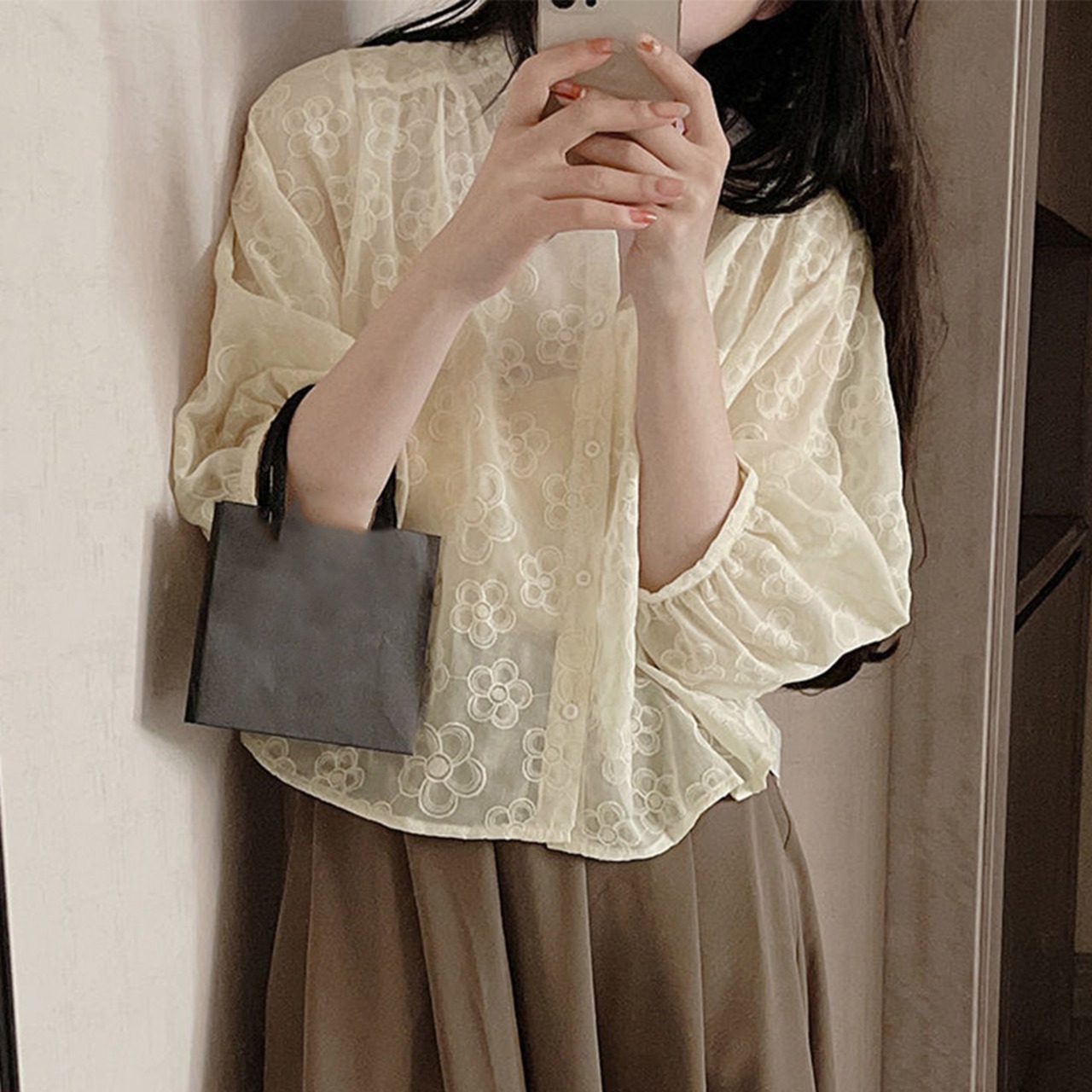 韓国ファッション シースルーブラウス きれいめ 七分袖 フラワーレース トップス シャツカーディガン レディース 春夏服