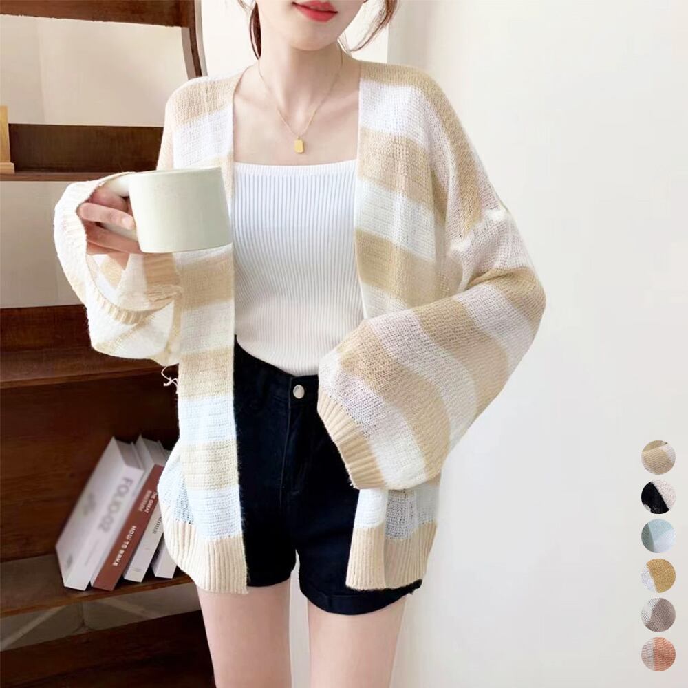 ニット羽織り 透け編み ボーダー柄ボレロカーデ サマーニットトップス バイカラー春夏秋カジュアル ライトアウター冷房対策