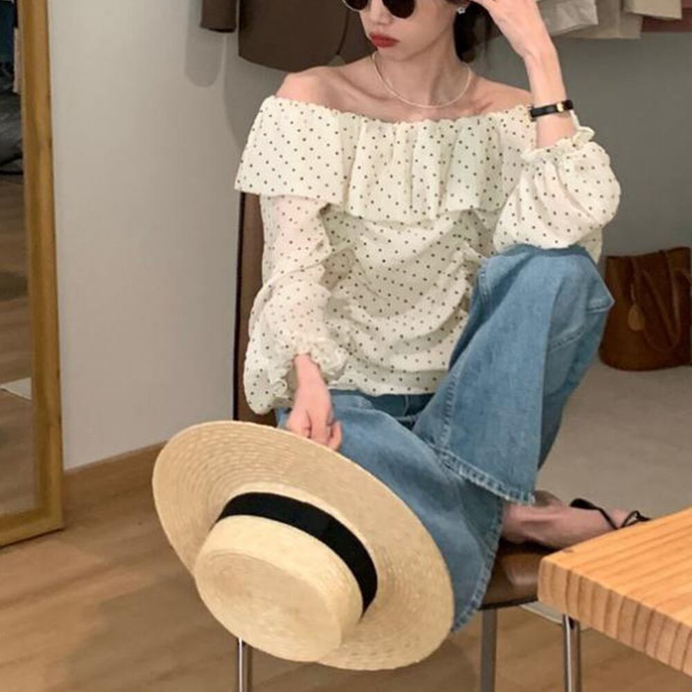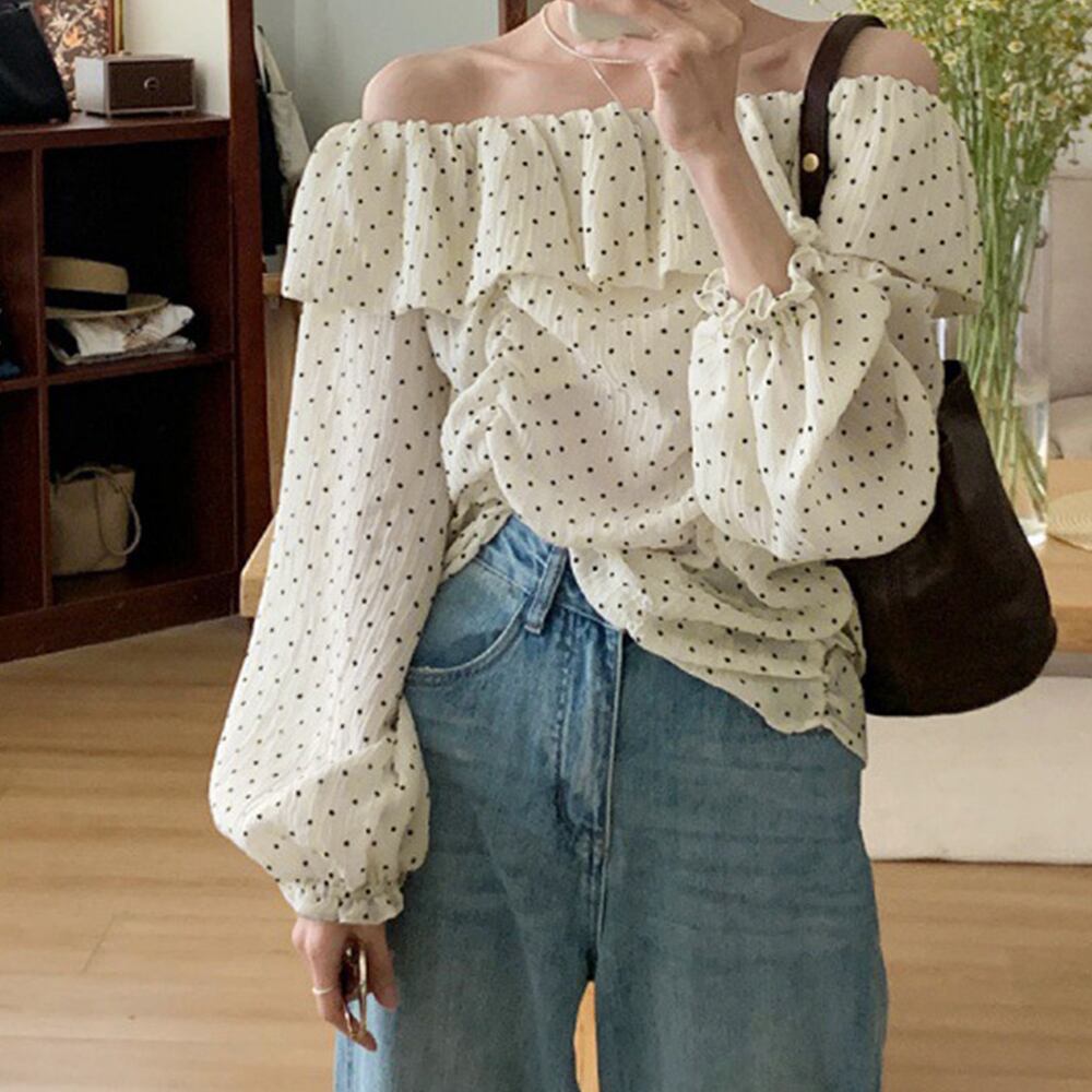 おしゃれ 長袖 フリルトップス ドット柄 水玉模様 大人可愛いブラウス きれいめ夏服 肩出しカットソー 韓国ファッション