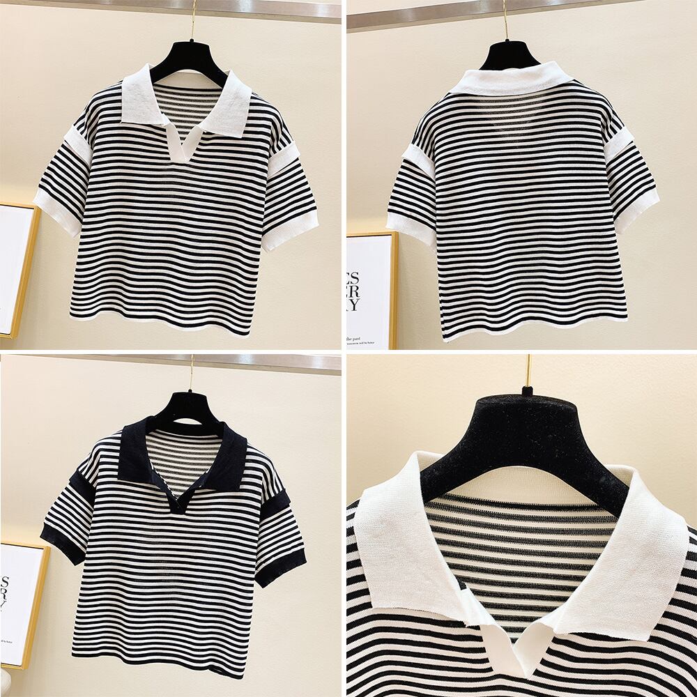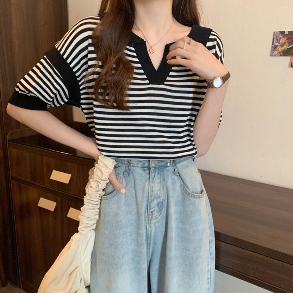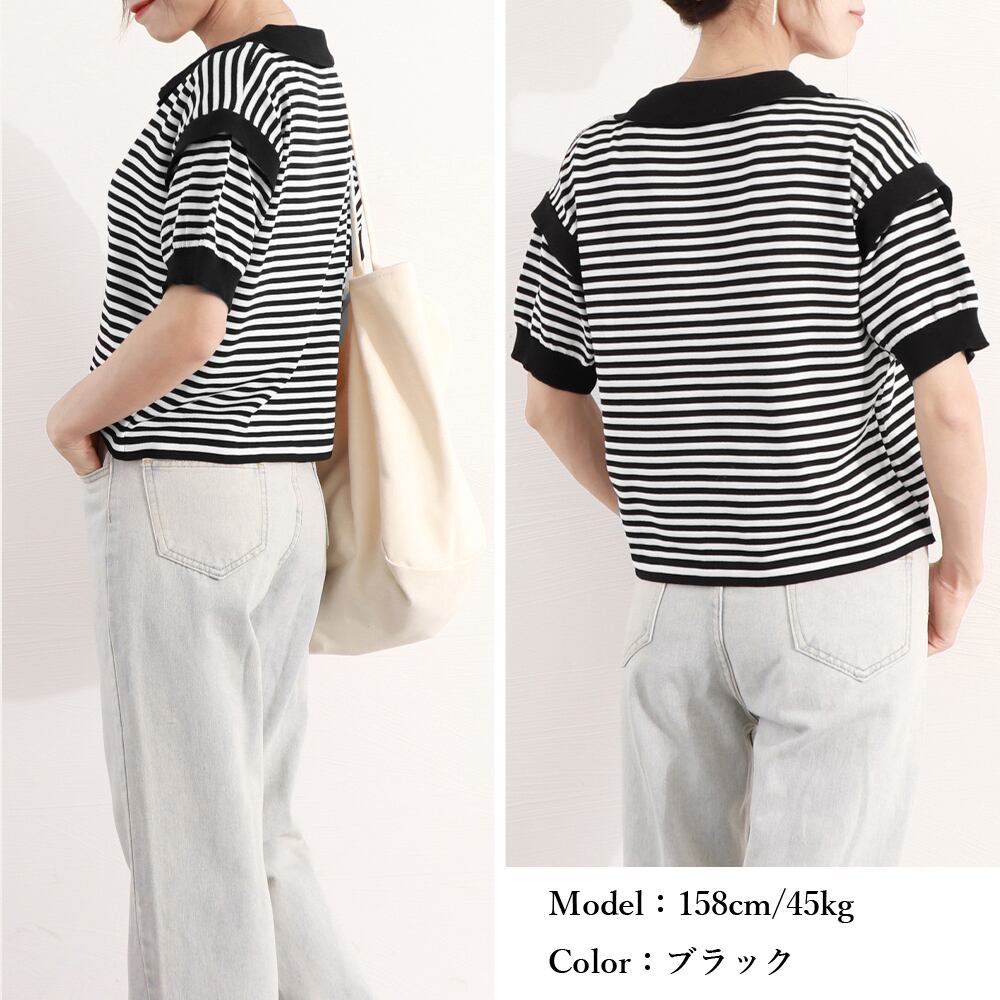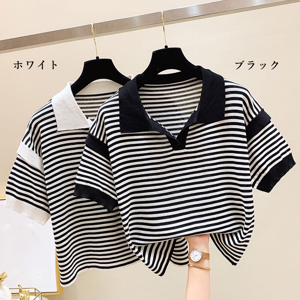 ニットtシャツ 薄手サマーニット 5分袖Vネック 襟付きカットソー ボーダー柄トップス 韓国ファッション カジュアル夏服