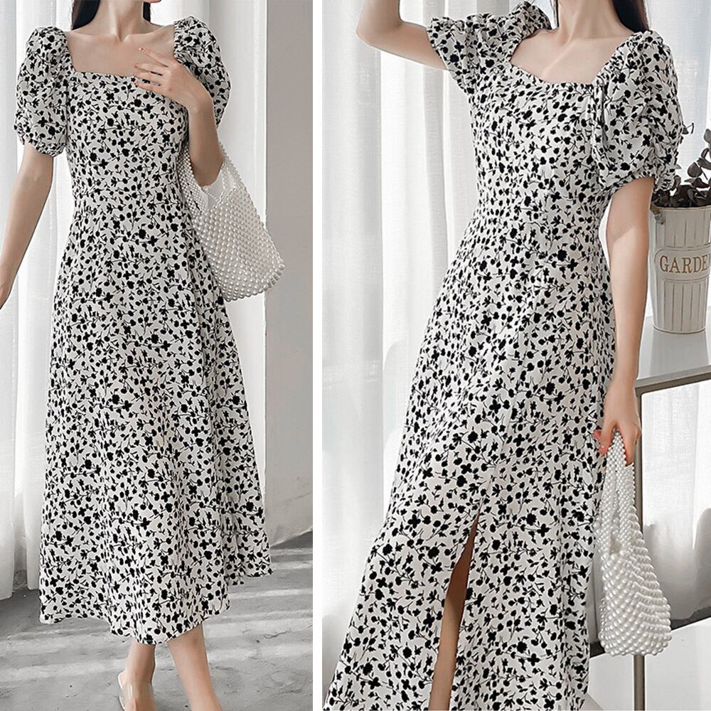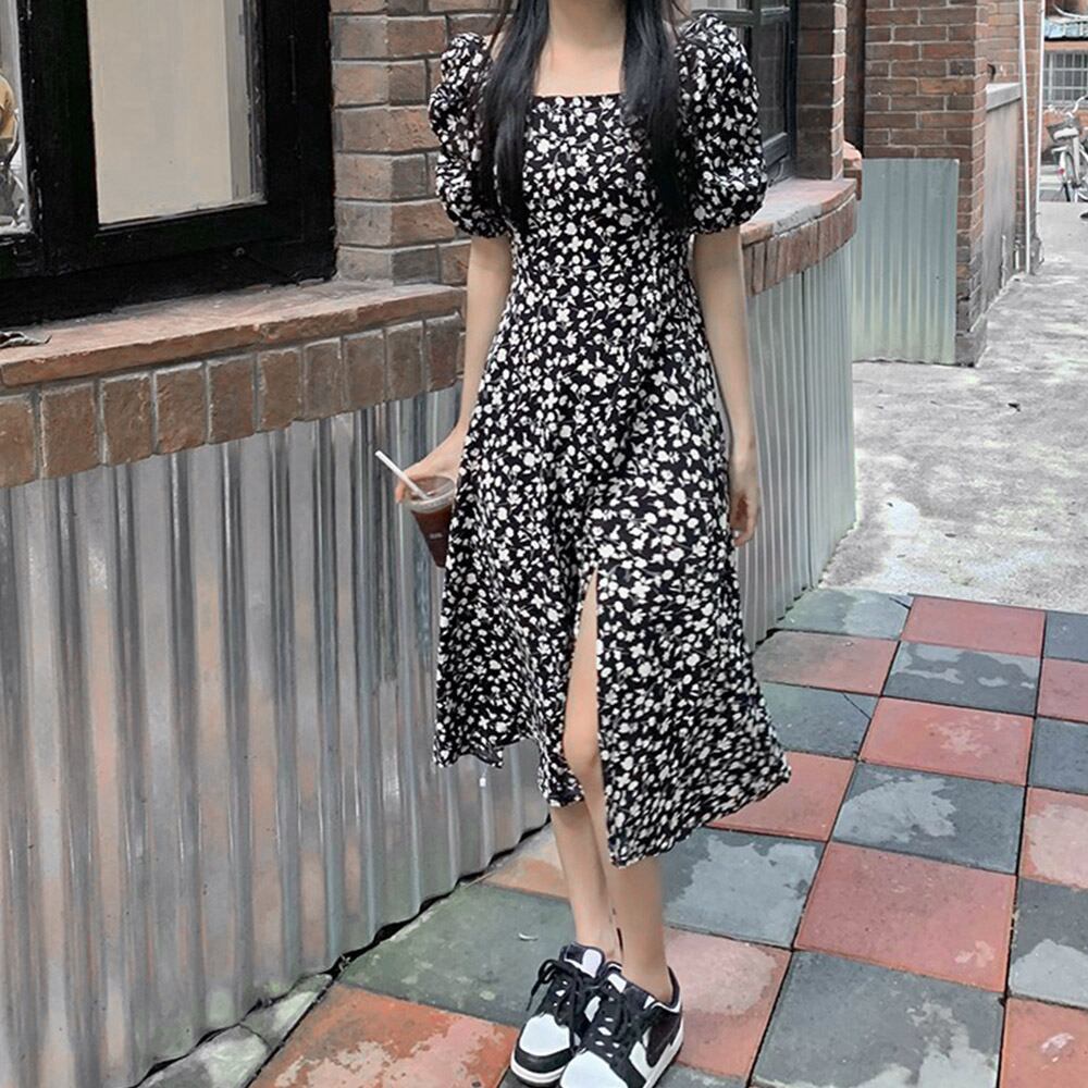 レディース きれいめ 春夏ワンピース パフスリーブ サマーワンピ スリット フレアワンピース Aライン ハイウエスト韓国