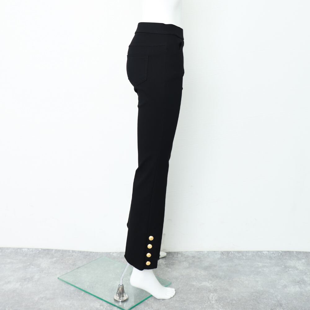 裾のボタンがポイントで、ハイウエストのスキニーシルエットのデニム。