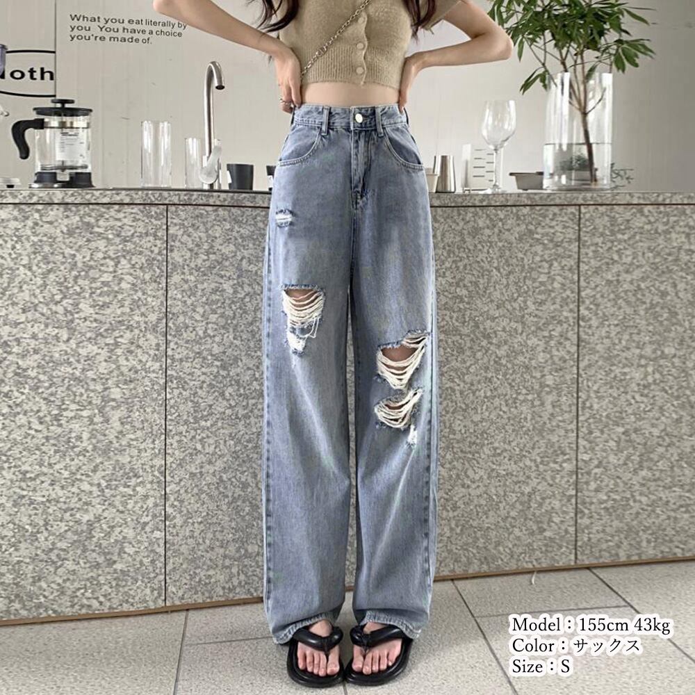 レディースのカッコいいスタイルを演出するクラッシュダメージデニムパンツです
