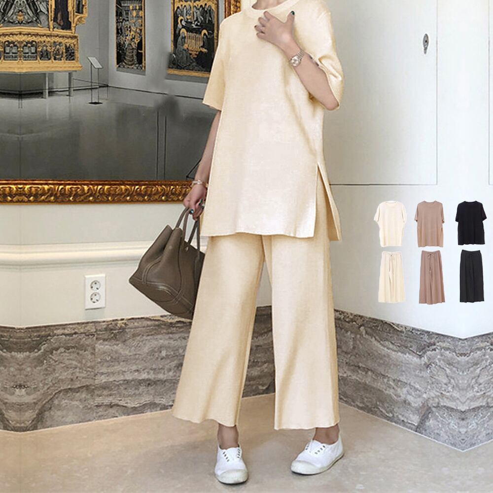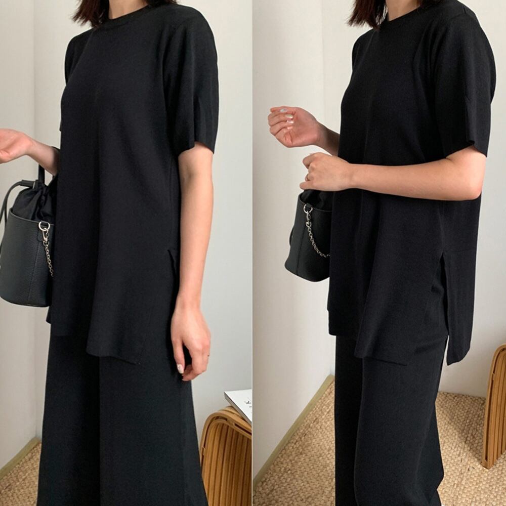 レディース スリット入りニットトップス ウエストゴム ワイドパンツ 2点セット ゆったり ベーシック アンサンブルニット