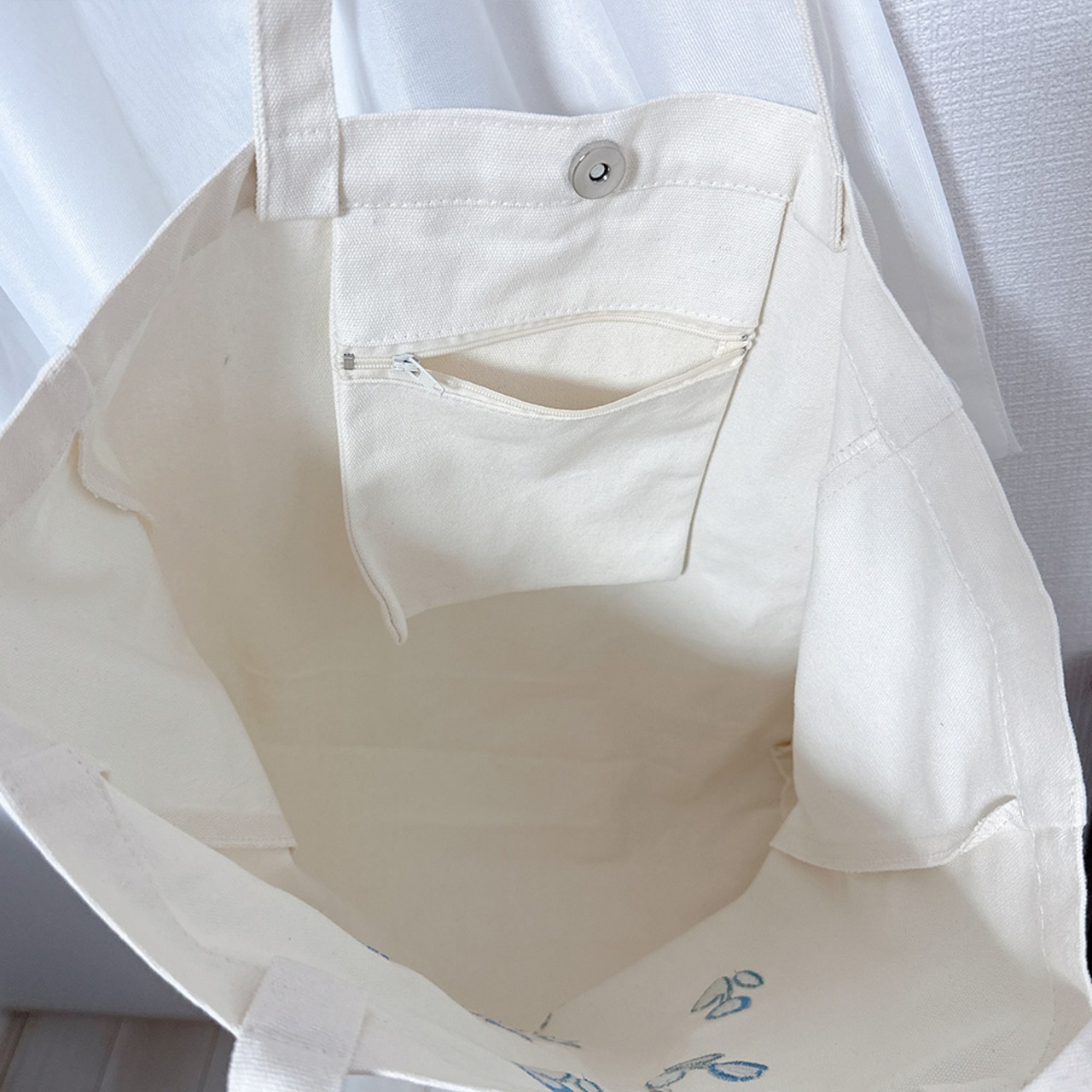 フロントにあしらわれた花柄刺しゅうがアクセントになったトートバッグ