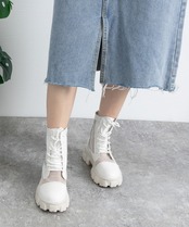重くなりがちなトラックソールにシアー素材でフェミニンスタイルに大変身するシースルーブーツ