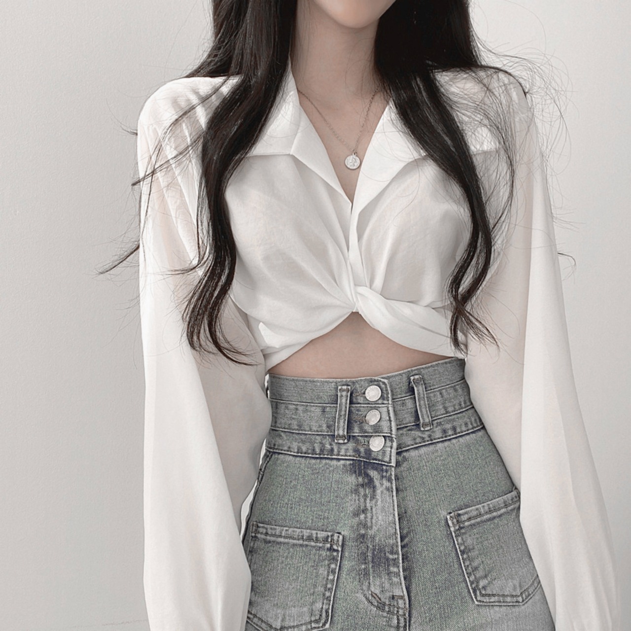 へそ出し 襟付きシャツ リボン レディースファッション クロップド丈トップス Vネック セクシー バックシャン 2way