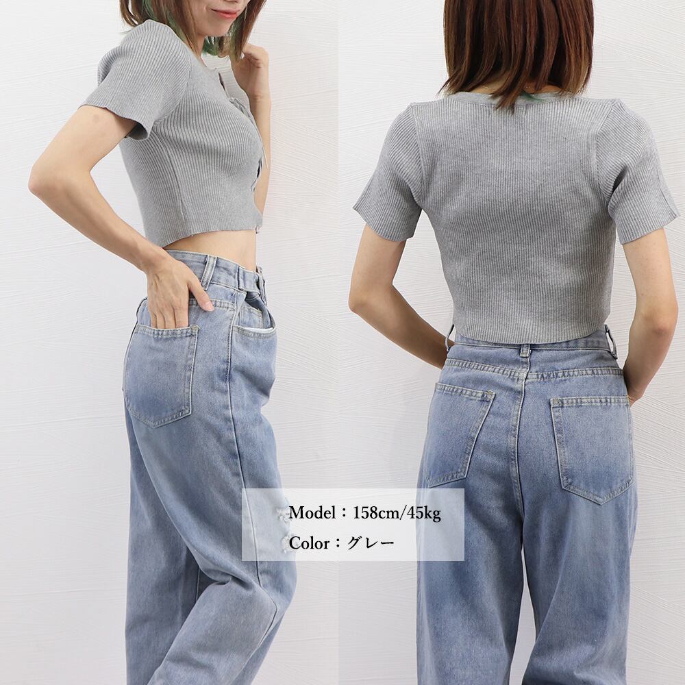 レースアップ プルオーバー 半袖クロップド丈 ニットカットソー ラウンドネック 韓国春夏コンパクトニットソー カジュアル