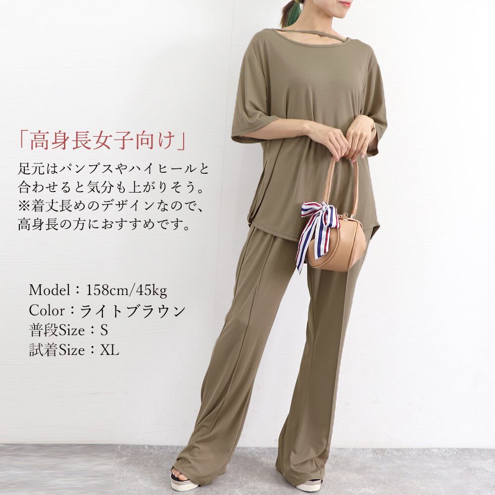 ゆったり アンサンブル 着やせ おしゃれ 半袖カットソー フレアパンツ 冷感タッチ 上下セット 無地 韓国 ハイウエスト