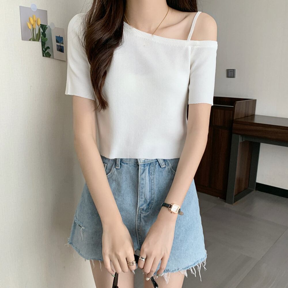 ワンショルダー×ストラップを組み合わせたモードなルックスのサマーニット