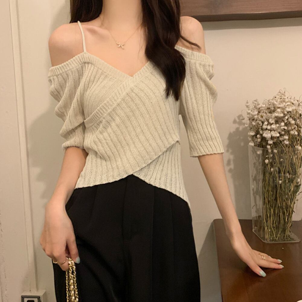 着やせ リブニット 鎖骨見せ トップス 半袖サマーセーター