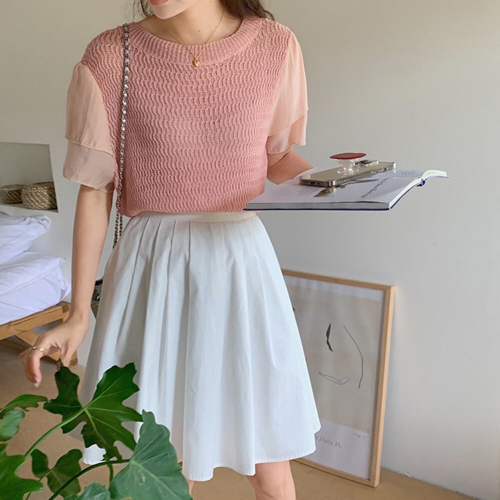 着やせニットトップ 無地 二重袖ニット 韓国風 きれいめ