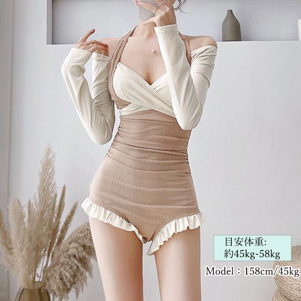 フリル水着 オールインワン水着 長袖 フロントクロス セクシー水着 盛れる水着 ハイウエスト 大人女子 体型カバー韓国風