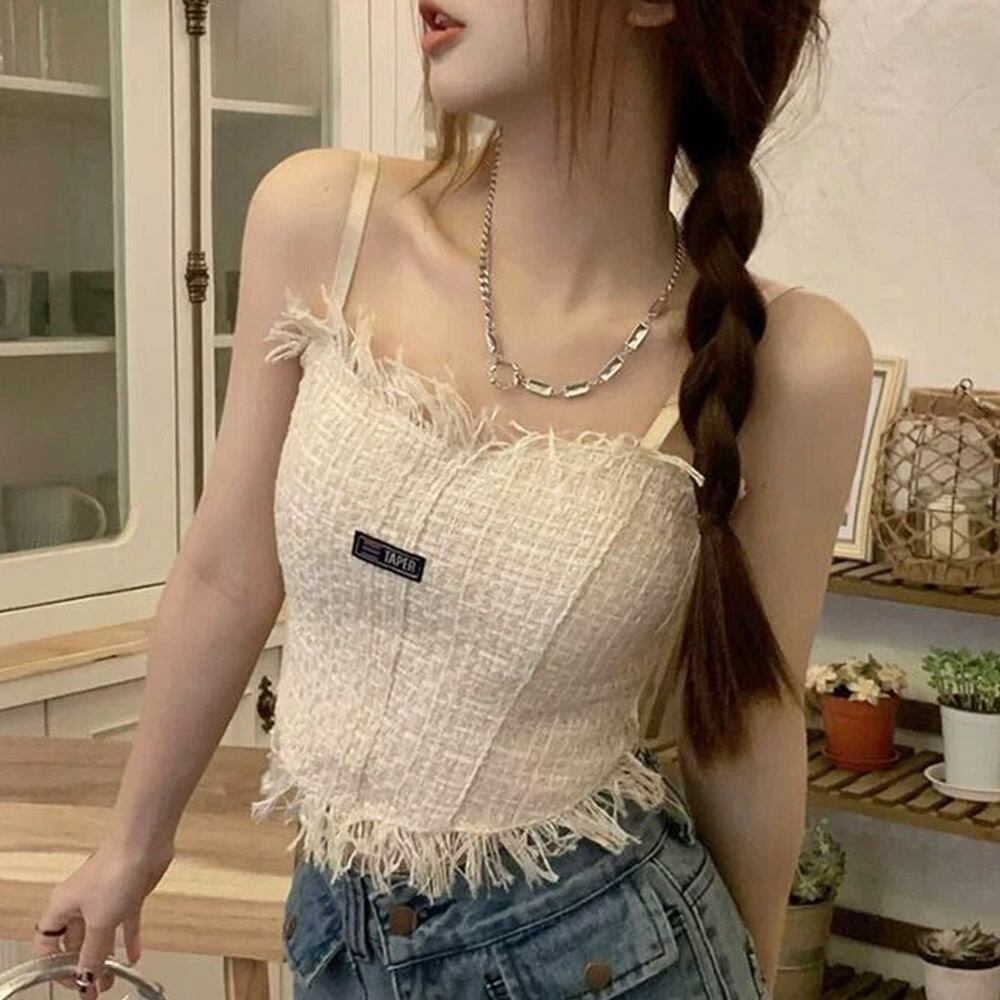 トップス クロップド丈 インナー きれいめ フリンジ レトロ カジュアル 背中見せ カップ付き ノースリーブ セクシー