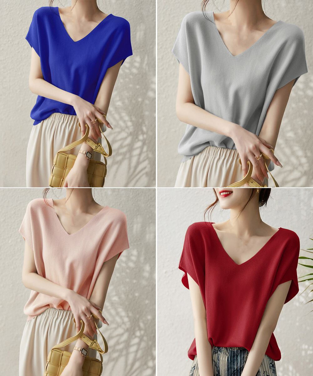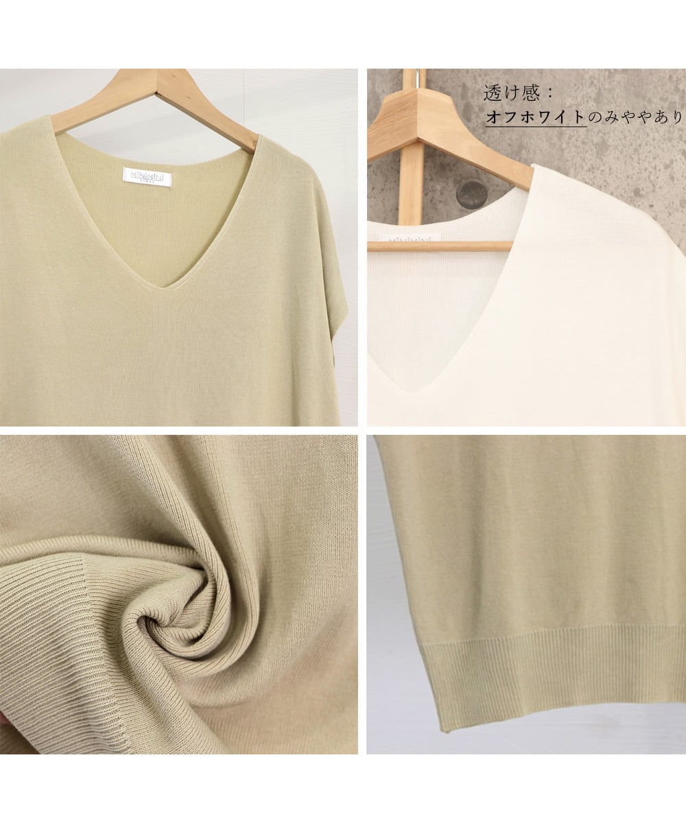 フレンチスリーブ ニットソー 体型カバー vネック 冷感タッチ 半袖 サマーニット きれいめ オフィスカジュアル 着やせ