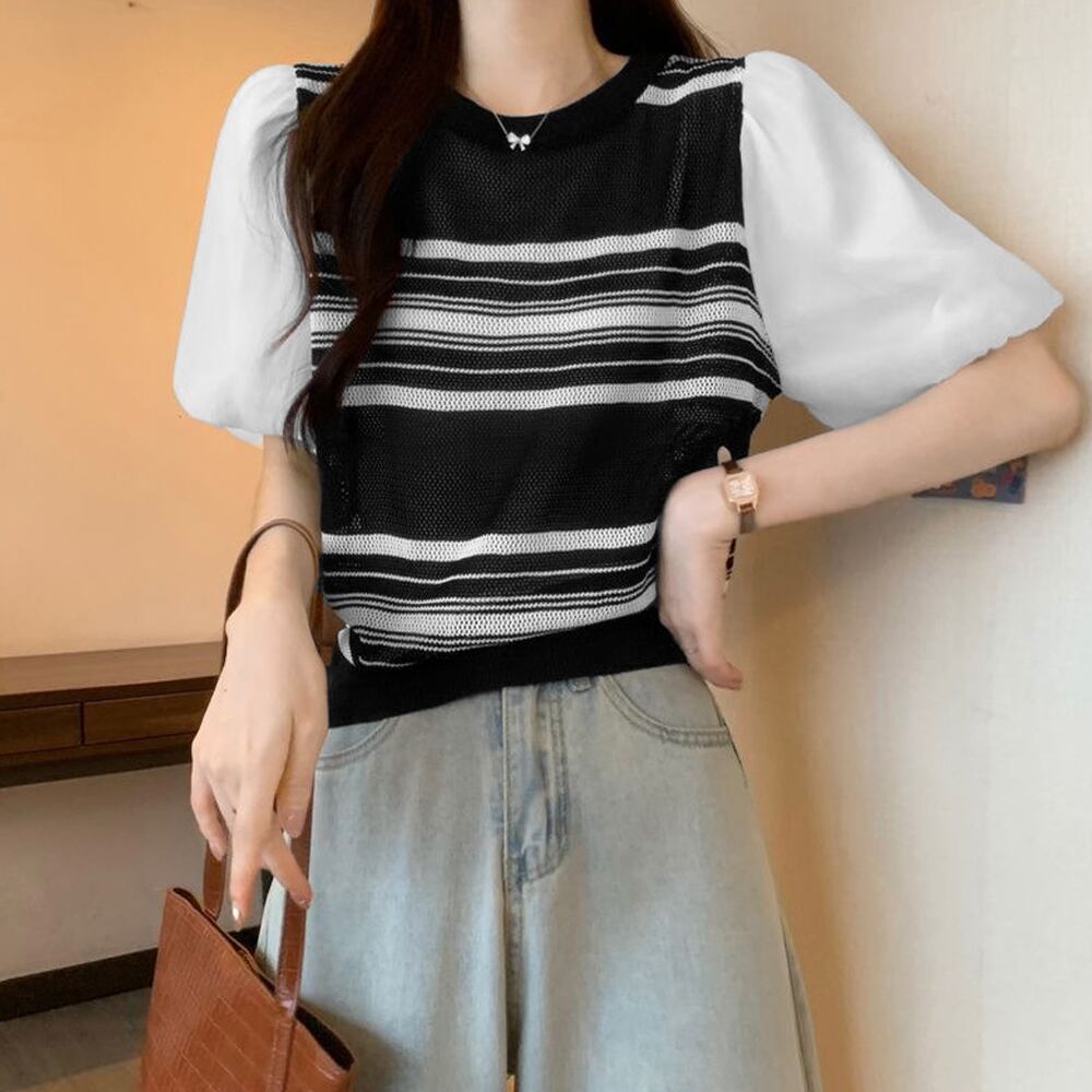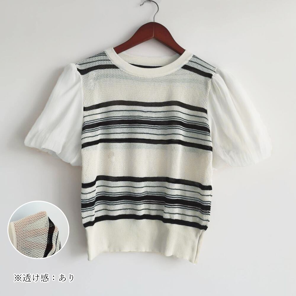 レディース パフスリーブ 透かし編みニット 大人可愛い ドッキングニット こなれ感 薄手 韓国 着やせニットブラウス