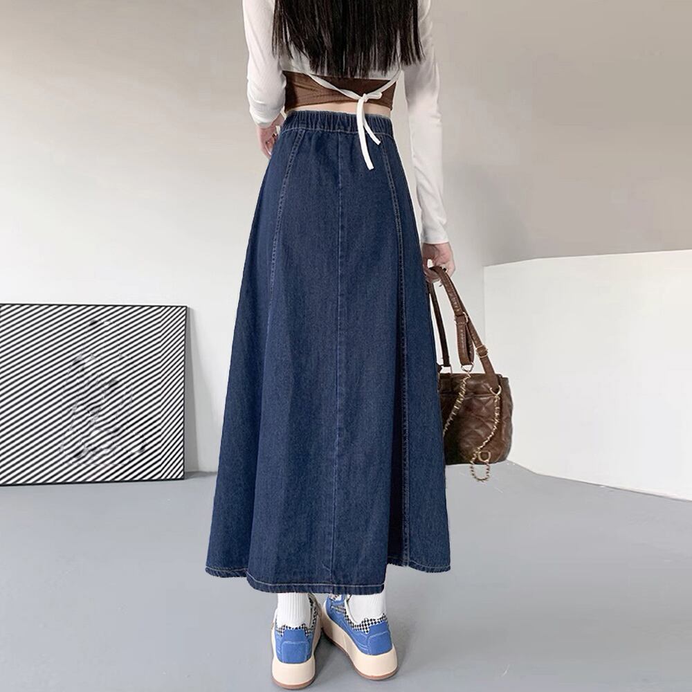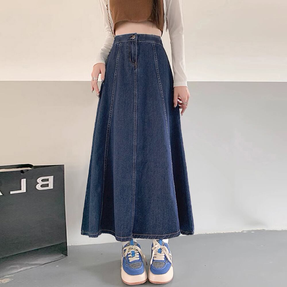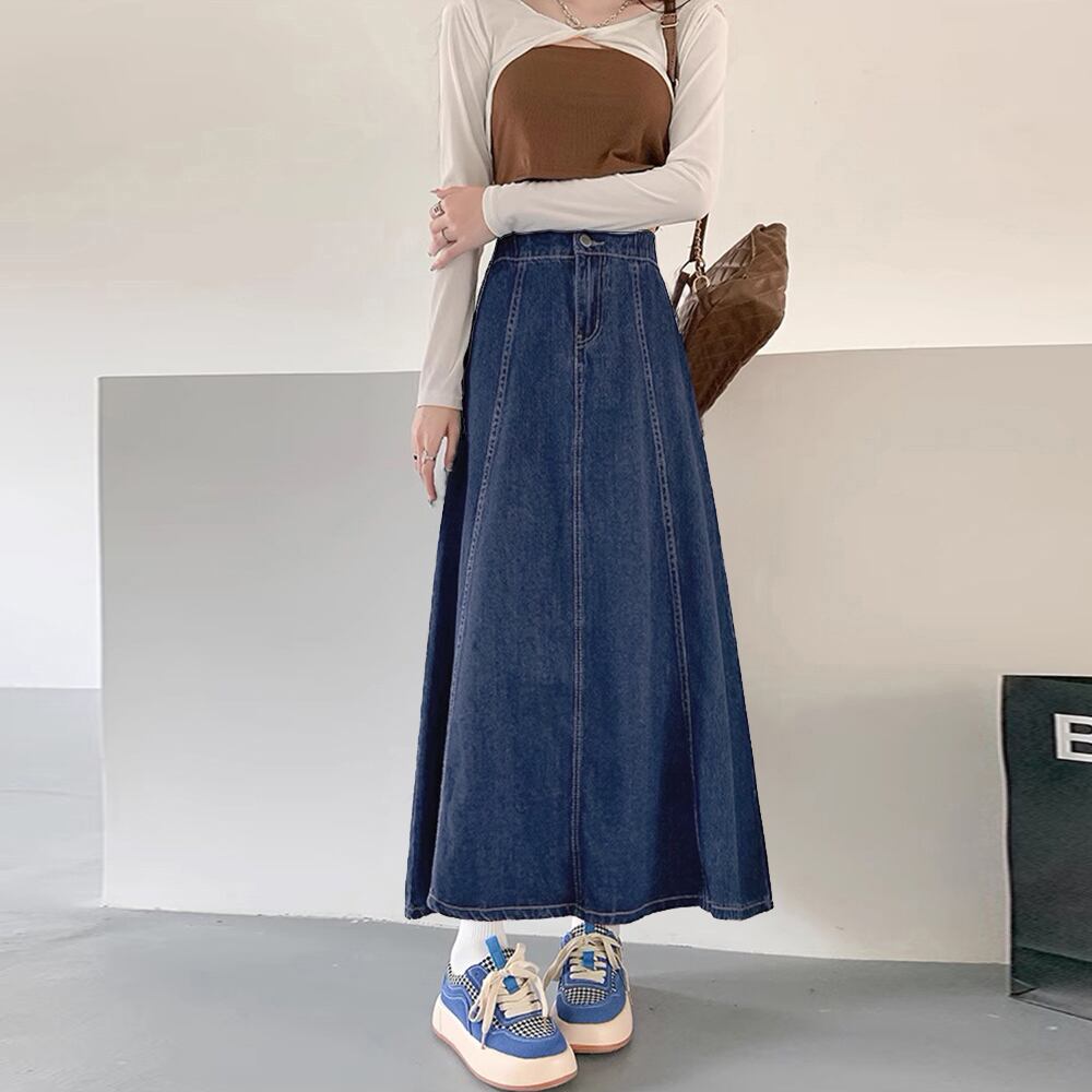 カジュアルコーデにもぴったりの長め丈のフレアデニムスカート