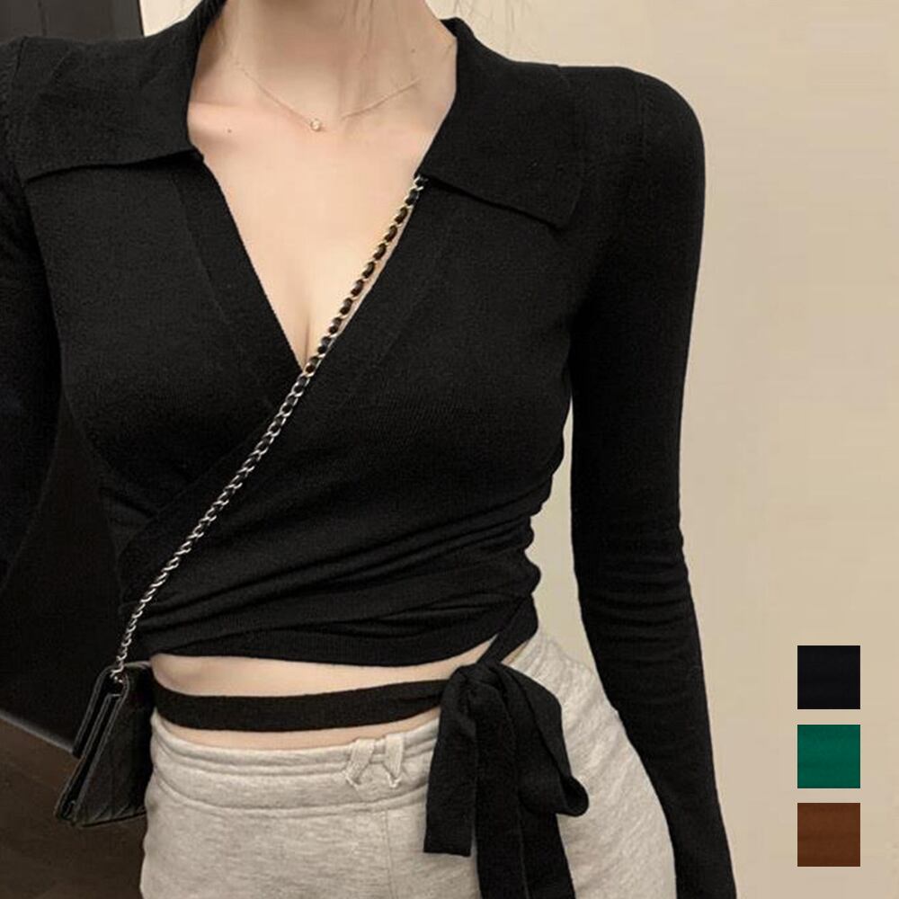 ラップDesignがオシャレ、ウエストマークでコーデが引き締まる格上げしてくれるカシュクールニットトップス