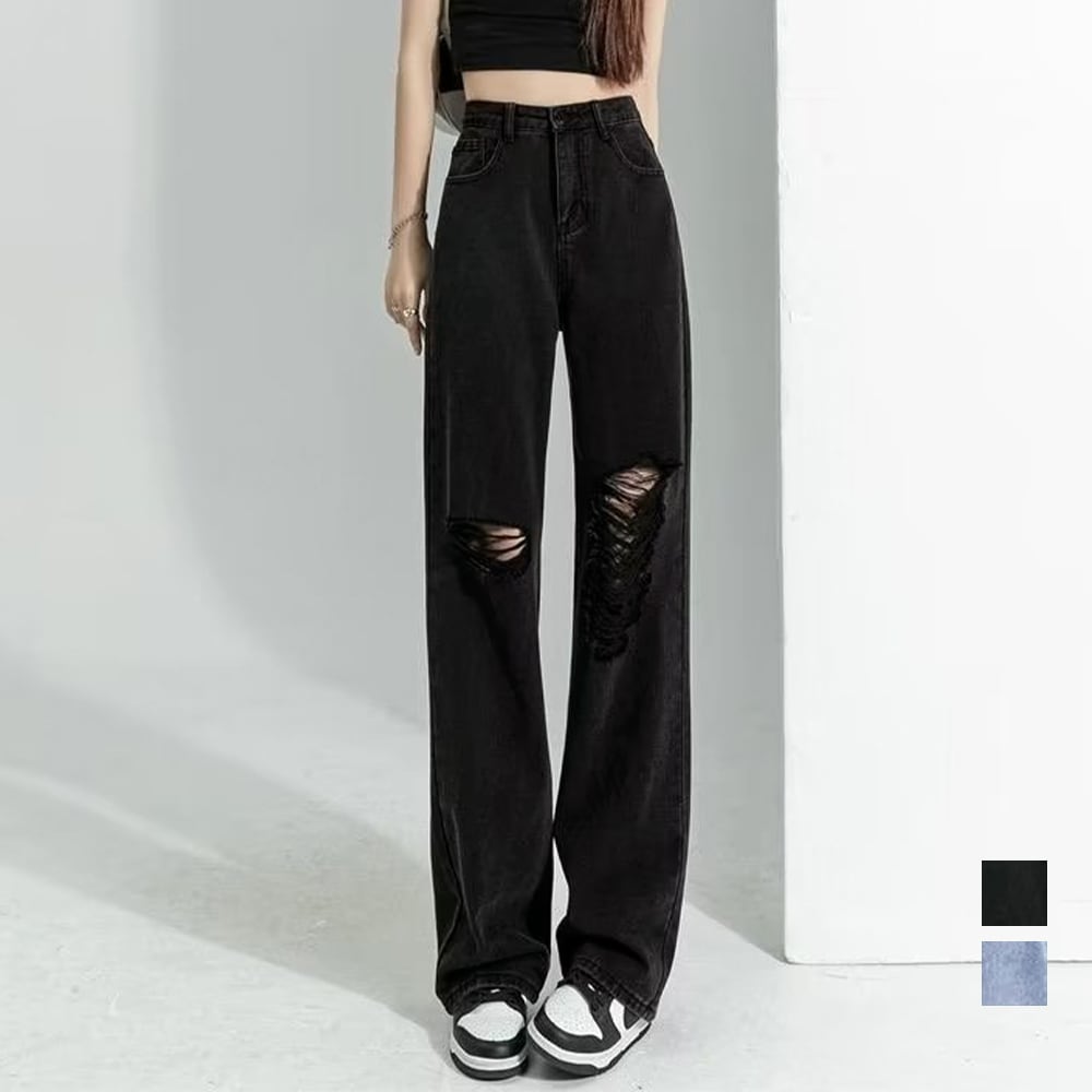 韓国ファッションのトレンドを取り入れたカットダメージデニムパンツ