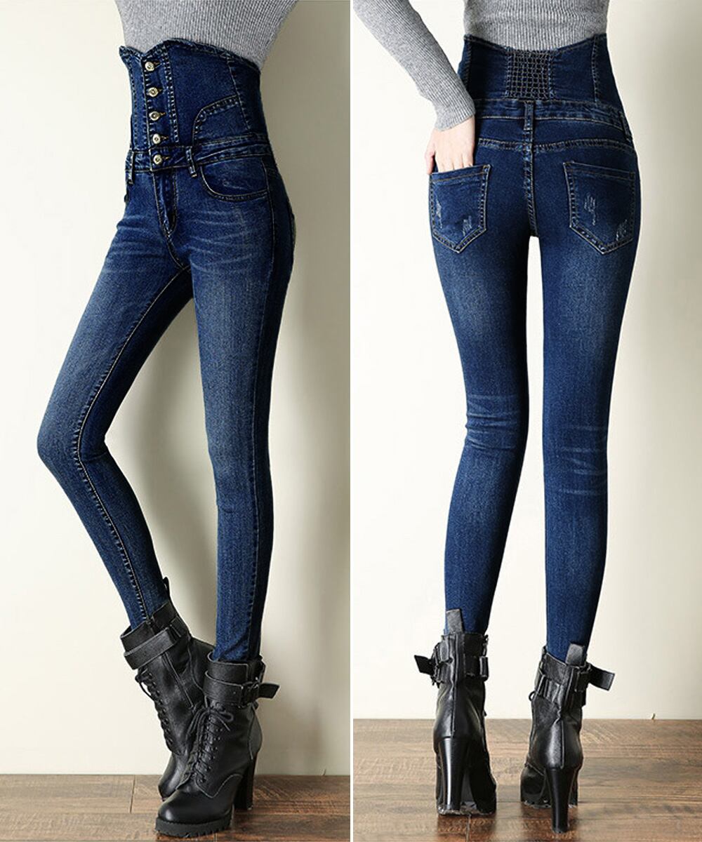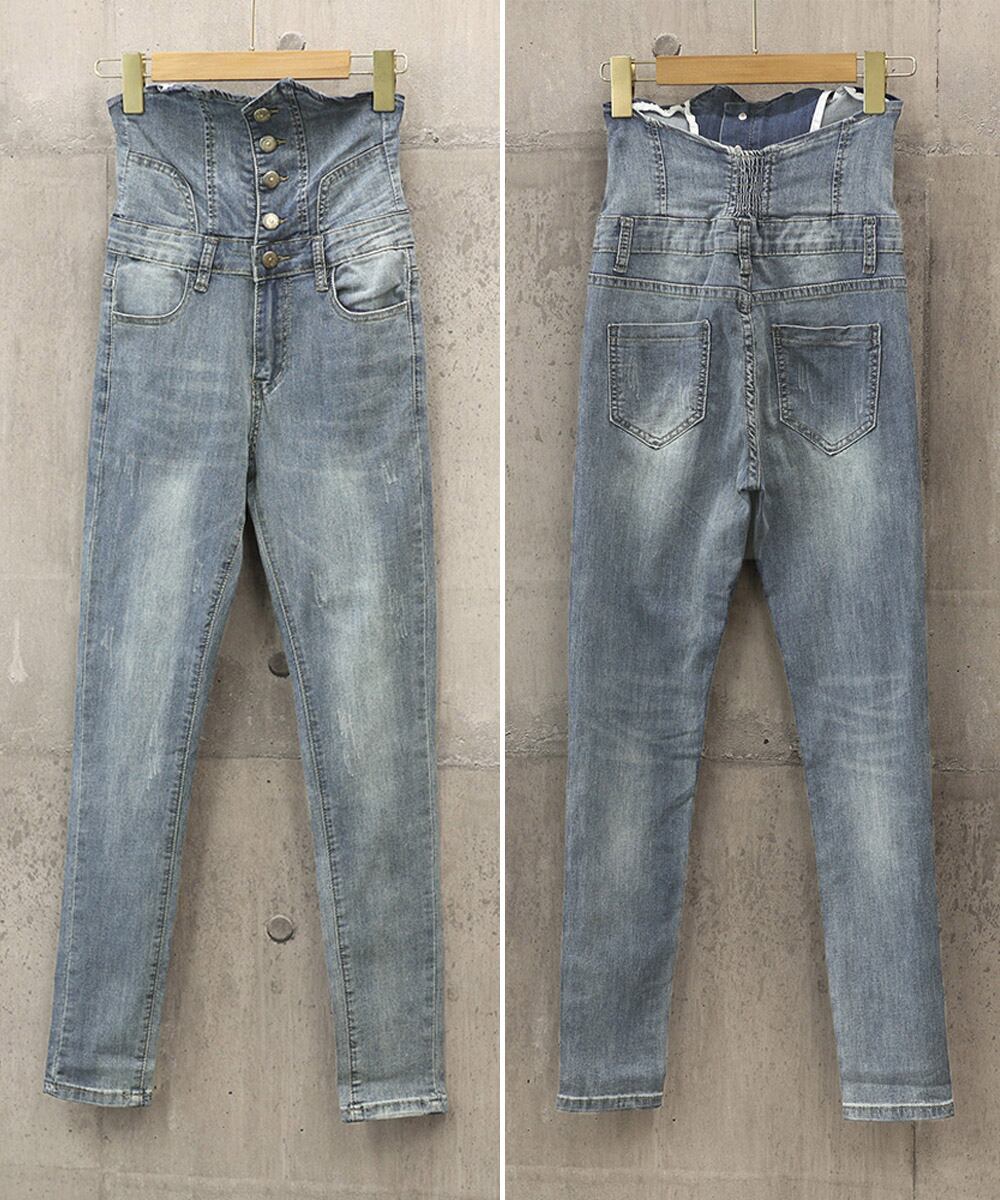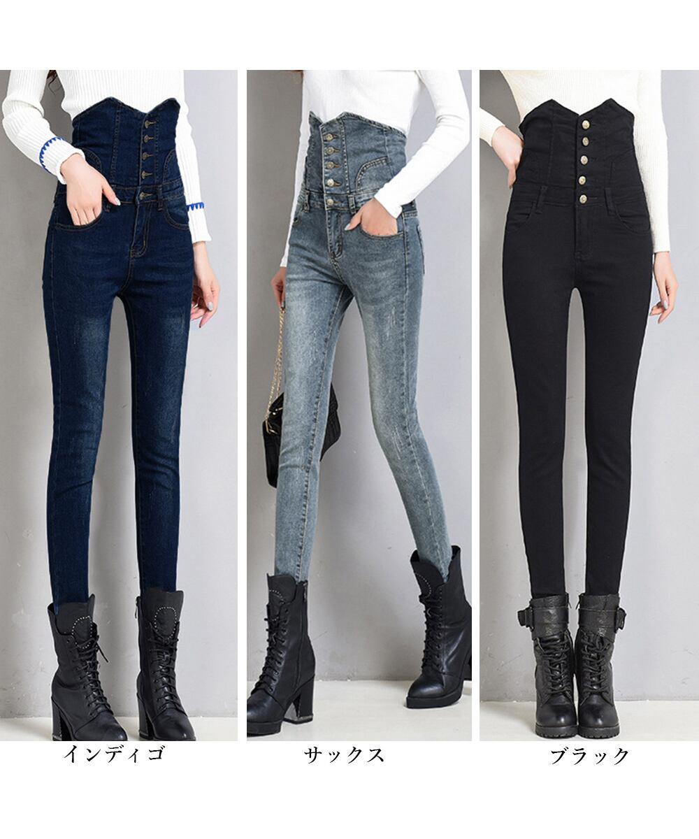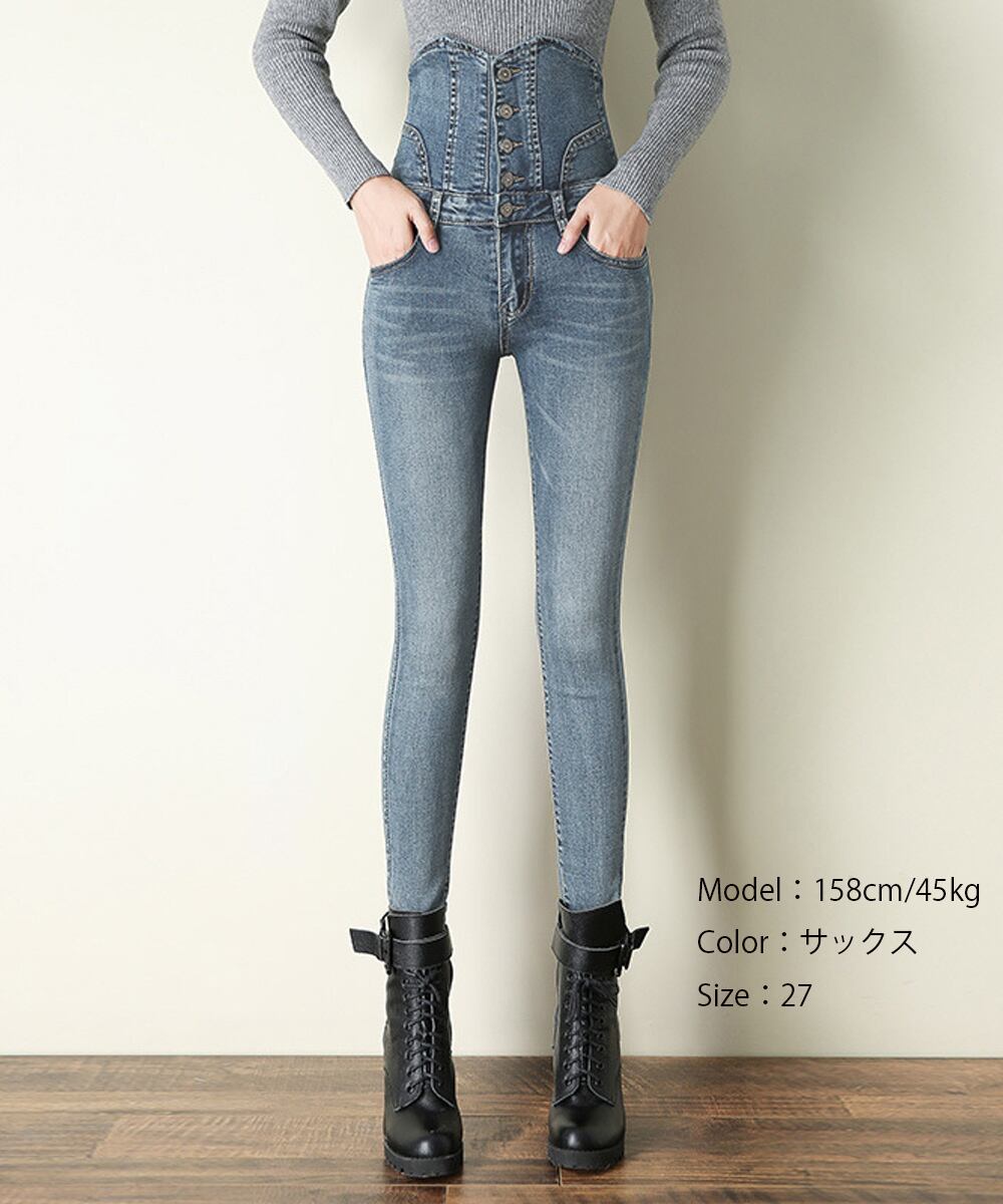 Vカットウエストが個性的、カジュアルながらもトレンディで他と被らないシングルブレストスキニーデニムパンツ