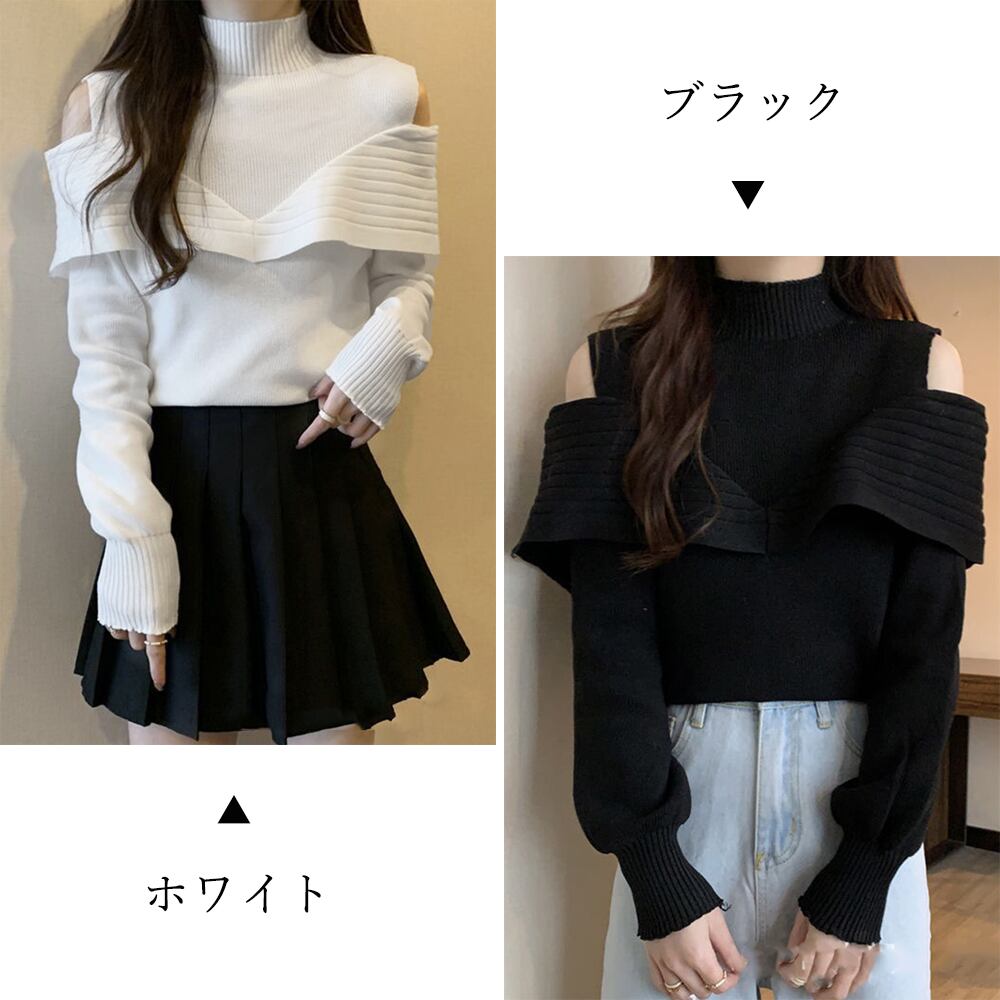 肩開きトップス無地 ニットウエア 長袖 着やせ ニットソー