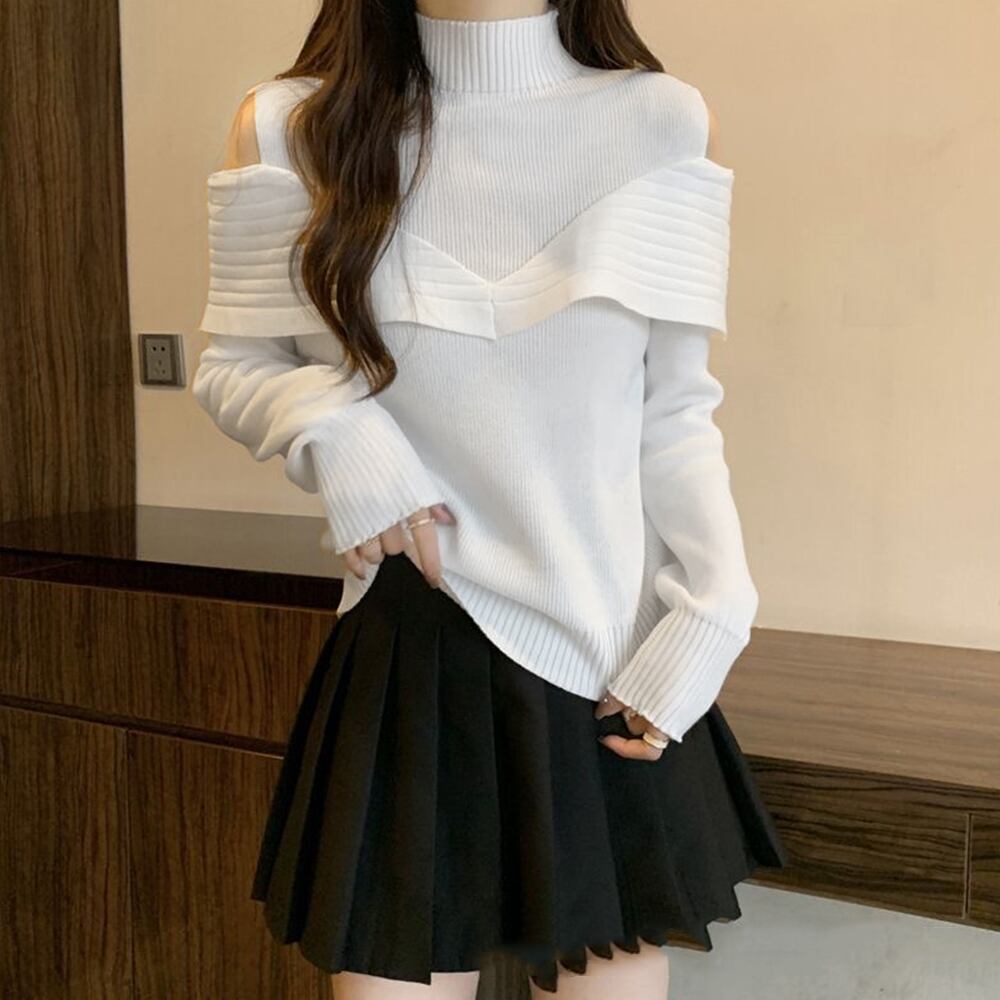 大人可愛い レイヤード風ニット レディース 肩見せ ニットプルオーバー 肩出し ニットセーター オープンカットニット秋冬