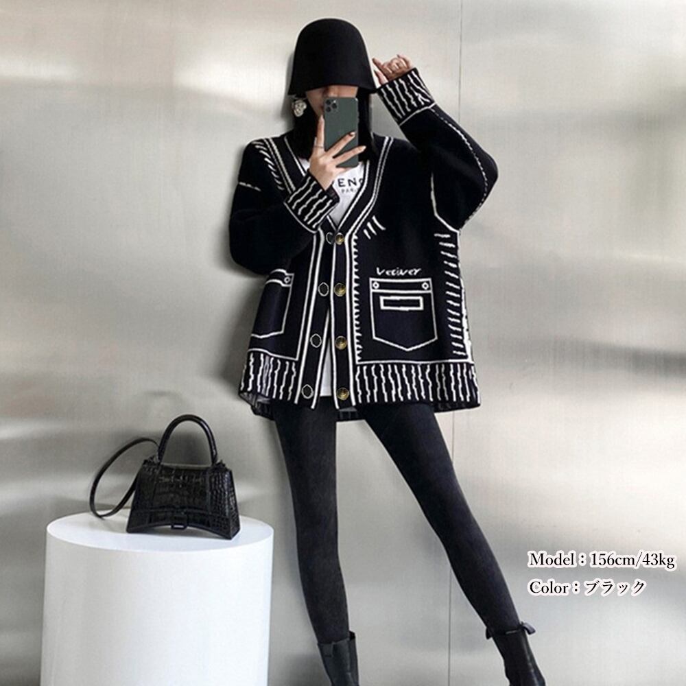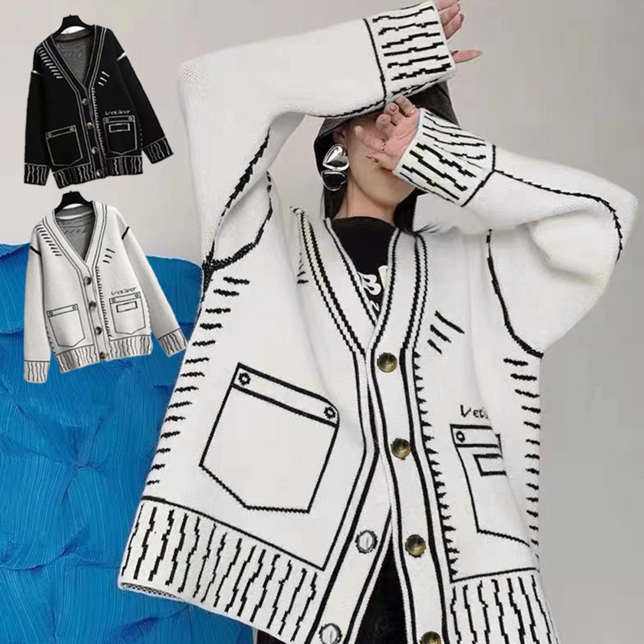 Vネックカーディガン オルチャン イラスト 中厚手ニットアウター モノトーンニット羽織り 10代20代30代 体型カバー
