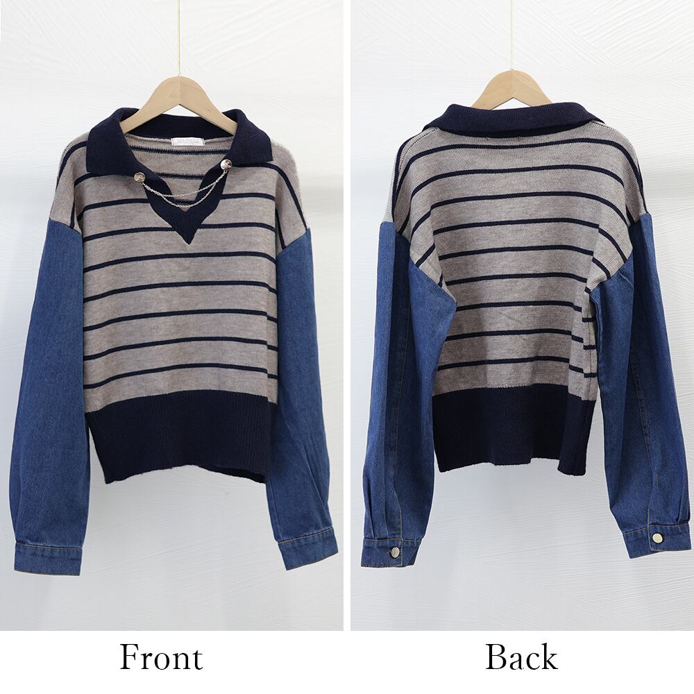 デニム切り替え ニットトップス 襟付き 長袖 ニットプルオーバー  レディース カジュアル ニットウェア おしゃれ 韓国