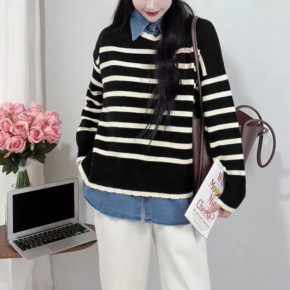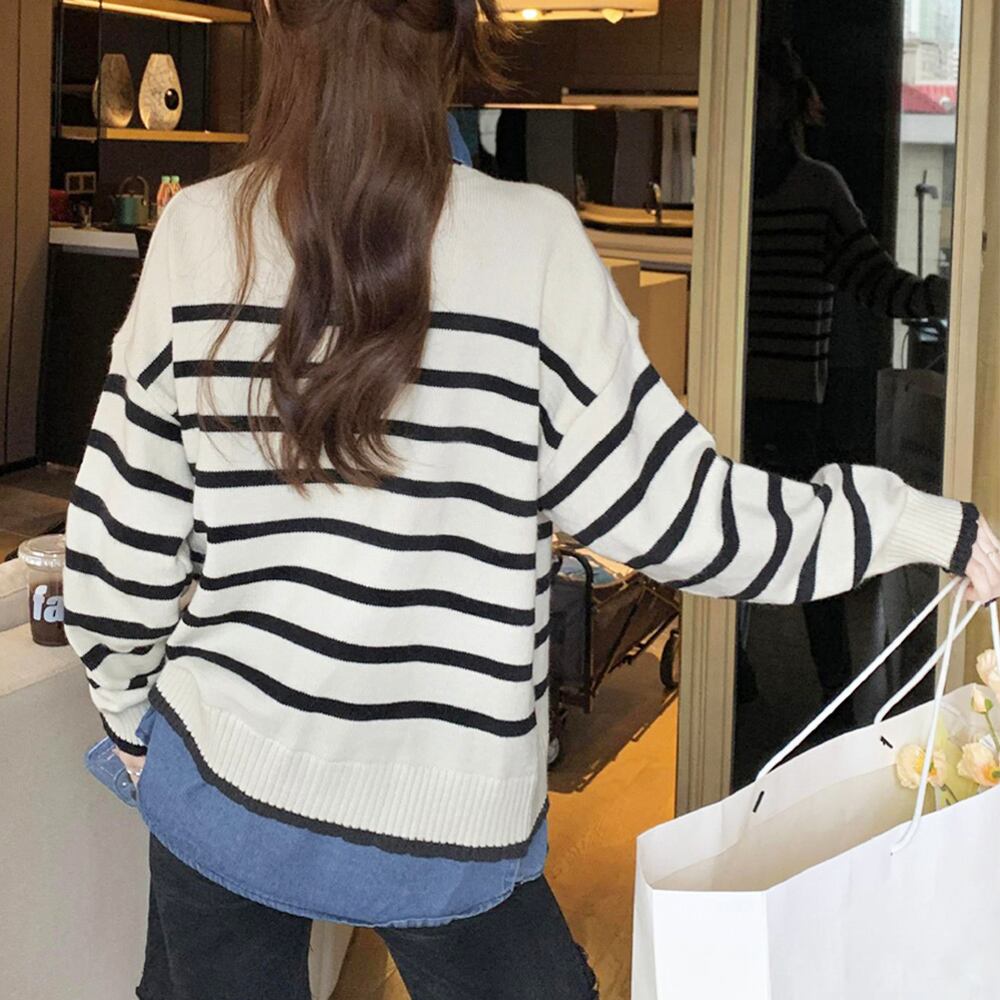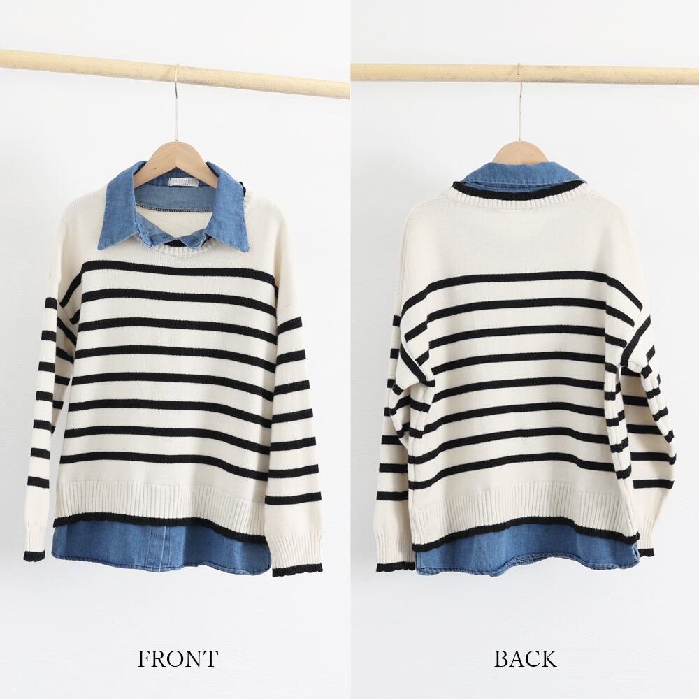 ボーダーニット デニムシャツ切り替え 長袖 レイヤード風トップス カジュアルきれいめ 体型カバー 秋冬トップス 重ね着風