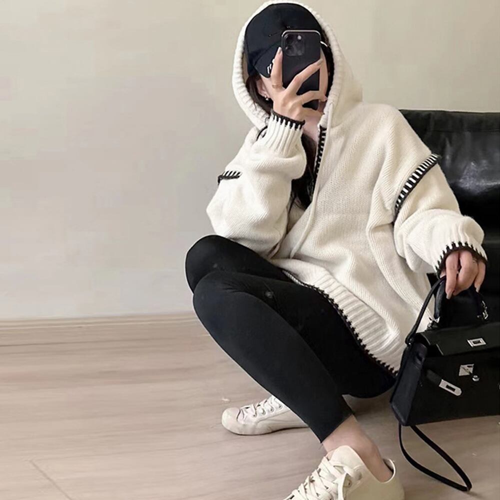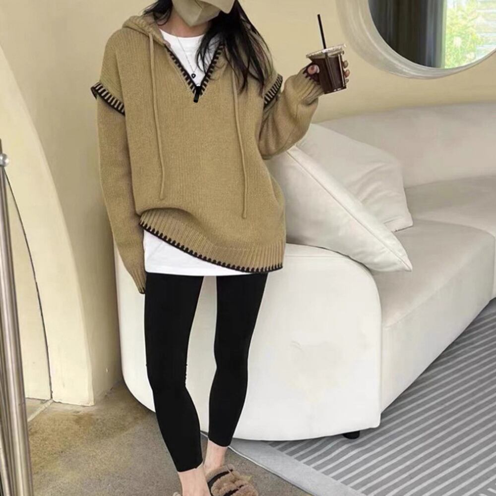 アースカラーで垢抜け間違いなし、ハーフジップが効いたルーズシルエットの韓国DESIGNの新作ニットパーカー