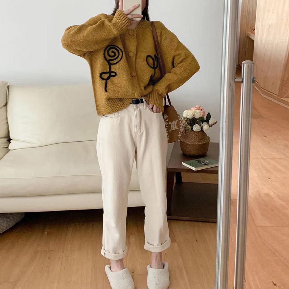 柔らかな中厚地ニットカーディガンbr>レトロモダンな風合いも感じる愛らしい花刺しゅうがアクセントに