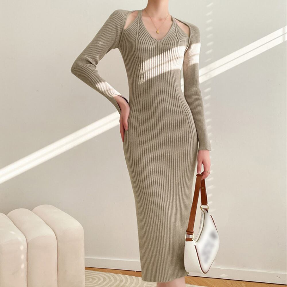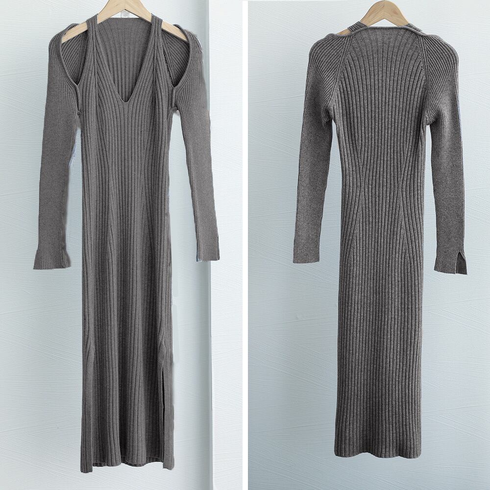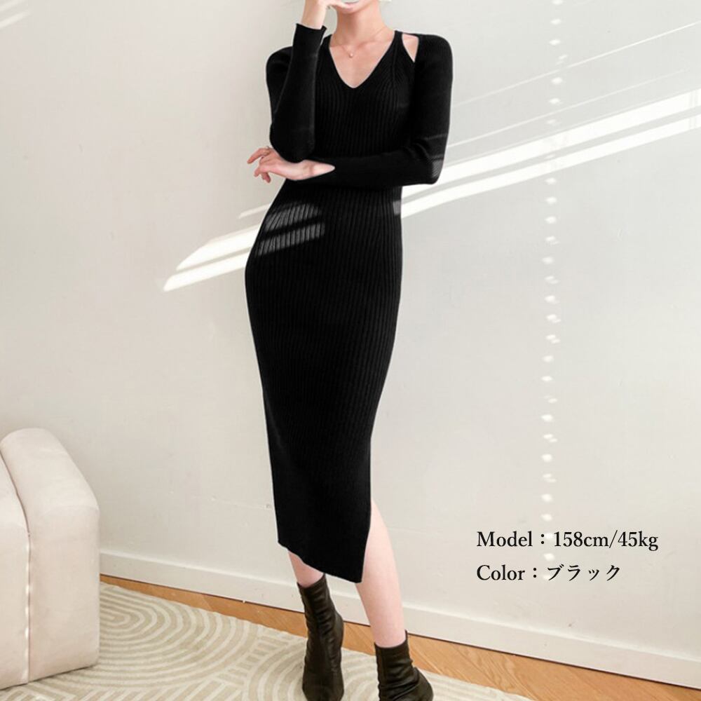 レディース セクシーボディコンワンピース 韓国 スリット ロングワンピース 長袖 フェミニン Vネックワンピ秋冬 着やせ