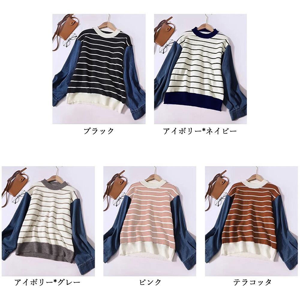 ボーダーニット デニムシャツ切り替え ドッキングトップス 長袖 カジュアルきれいめ 重ね着風 ニットプルオーバー お洒落
