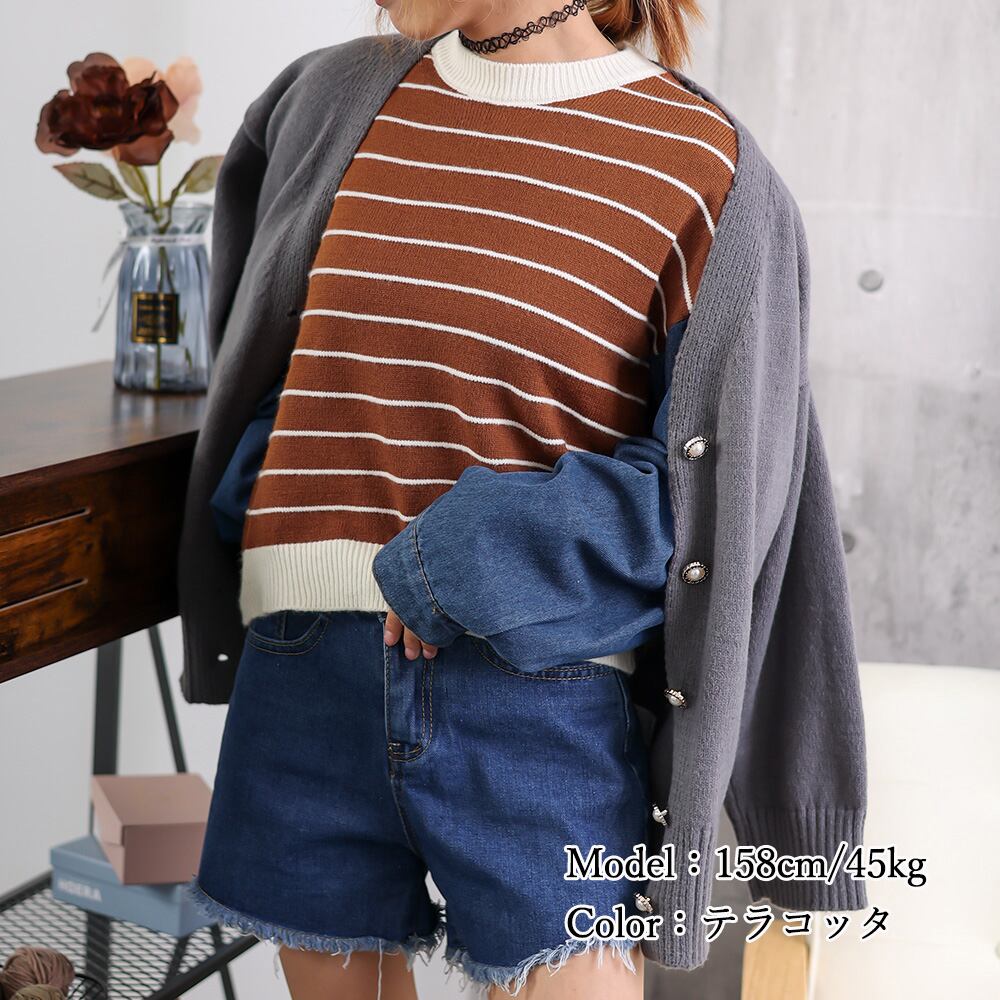ボーダーニットとデニムシャツを重ね着したようなDESIGN、着膨れせず着やせするレイヤード風トップス